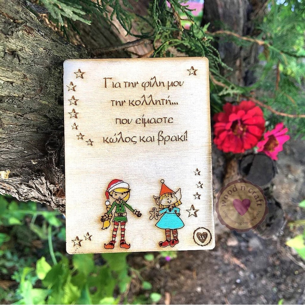 Πρωτότυπο ξύλινο μαγνητάκι με δύο κοριτσάκια ξωτικά και αφιέρωση για την φίλη μου την κολλητή που είμαστε κώλος και βρακί!