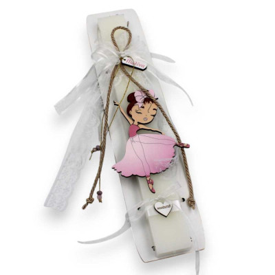 Χειροποίητη πασχαλινή λαμπάδα με ξύλινο στοιχείο μπαλαρίνα διακοσμημένη με κορδέλες, κορδόνι, δαντέλα και μία ροζ πέρλα!