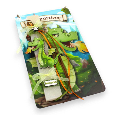 Η πλακέ αρωματική λαμπάδα, μήκους 25 εκ., είναι διακοσμημένη με ξύλινη φιγούρα δράκου, διαστάσεων 10 εκ., με UV εκτύπωση σε ζωηρά πράσινα χρώματα που τραβούν αμέσως το βλέμμα και ξυπνούν τη φαντασία των παιδιών.