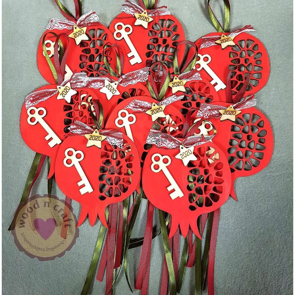 Πρωτότυπο ξύλινο χειροποίητο γούρι σε σχέδιο μισό διάτρητο ρόδι βαμμένο και διακοσμημένο με ένα κλειδί, αστεράκι χαραγμένο με τη νέα χρονιά και κορδελάκια!