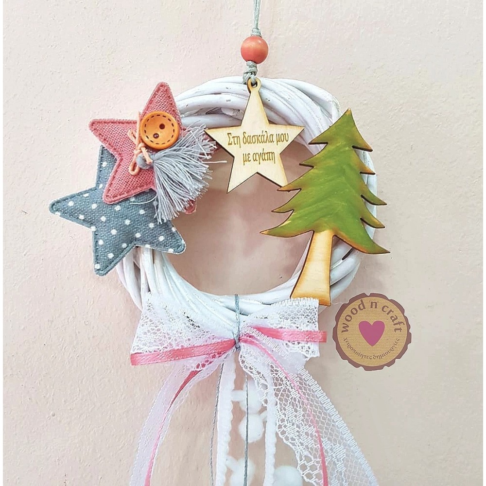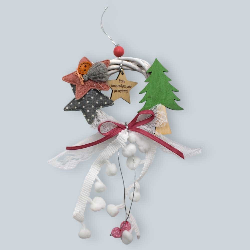 Μοναδικό ξύλινο πλεχτό στεφανάκι σε λευκό χρώμα διακοσμημένο με στολίδια χριστουγεννιάτικα, κρεμαστό αστεράκι με αφιέρωση, δαντέλα, κορδέλες και χάντρες!