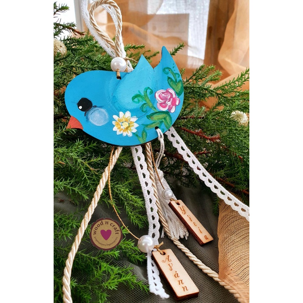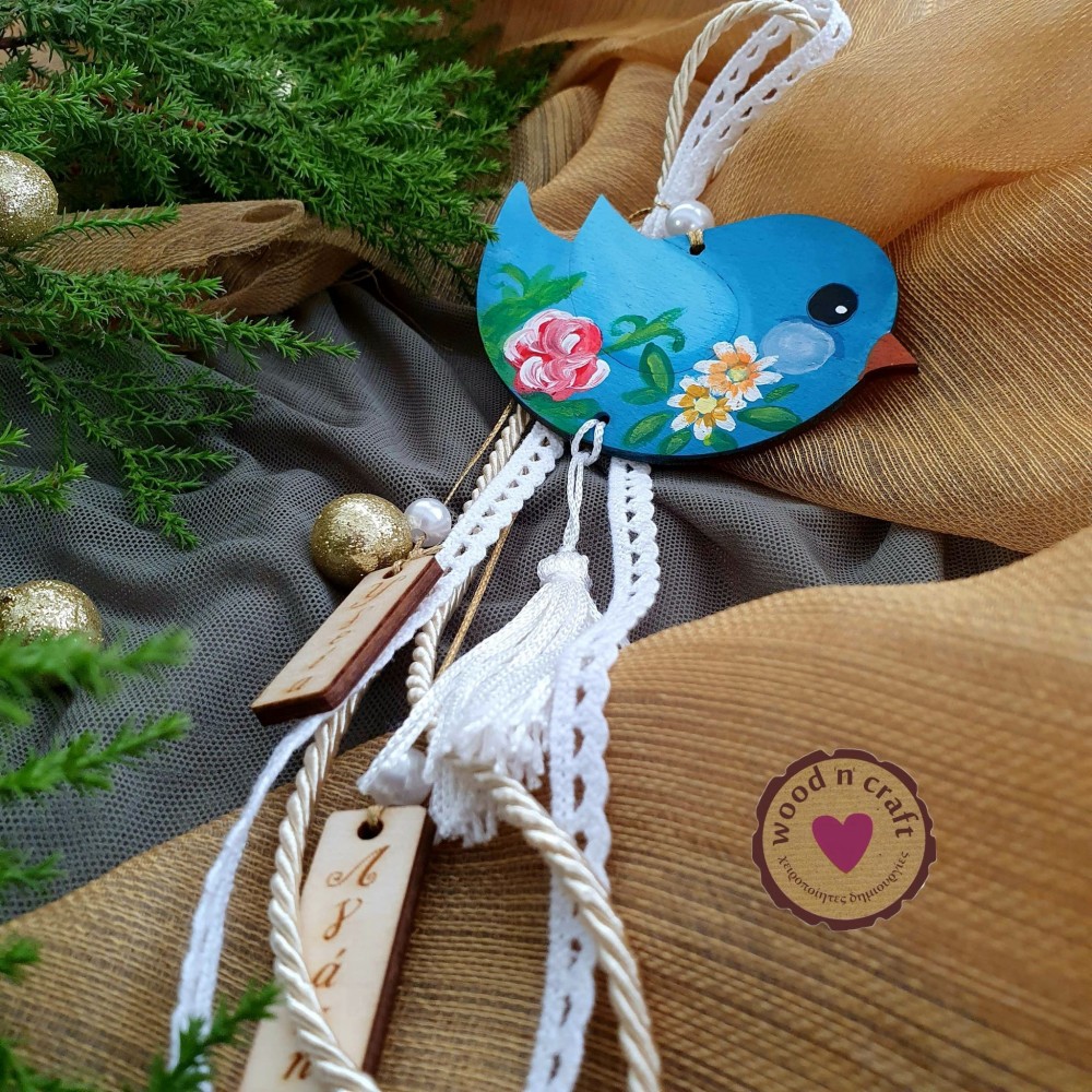 Μοναδικό ξύλινο γούρι σε σχέδιο πουλάκι με λουλουδάκια και διακοσμημένο με κορδέλα, κορδόνι, περλίτσες και κρεμαστά ξύλινα στοιχεία με χαραγμένες ευχές!