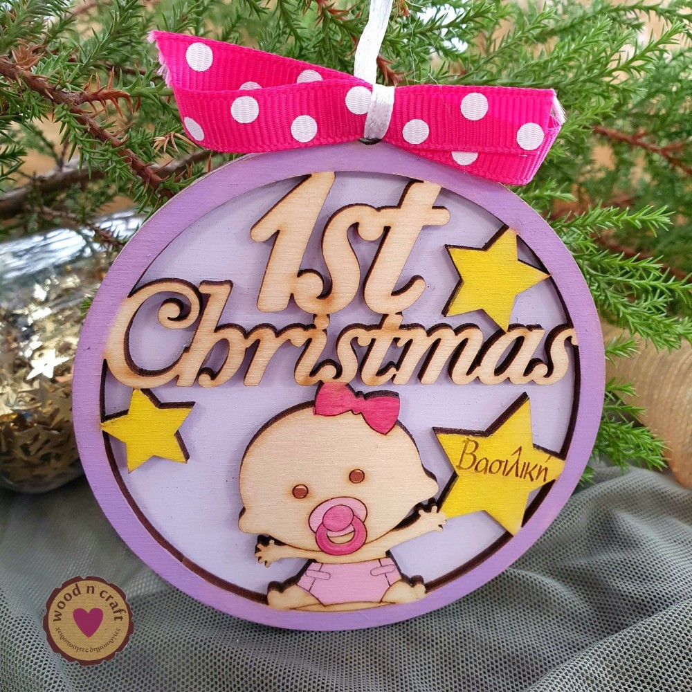 Μοναδικό χριστουγεννιάτικο ξύλινο στολίδι Baby's 1st Christmas με μωράκι και το όνομα της επιλογής σας χαραγμένο σε αστέρι. Μια πρωτότυπη μπάλα για το χριστουγεννιάτικο δέντρο, βαμμένη και διακοσμημένη με φιογκάκι σε αποχρώσεις της επιλογής σας.