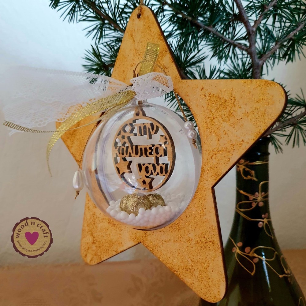 Χριστουγεννιάτικο στολίδι αστέρι με κρεμαστό ξύλινο στεφάνι με αφιέρωση σε διάφανη μπάλα. Μοναδική χειροποίητη δημιουργία σε ξύλινο αστέρι γεμάτο χρυσόσκονη.. με μπάλα πλεξιγκλάς διακοσμημένη με λευκές και χρυσές μπαλίτσες, κορδελάκια και αφιέρωση για το δικό σας Χριστουγεννιάτικο αστέρι!