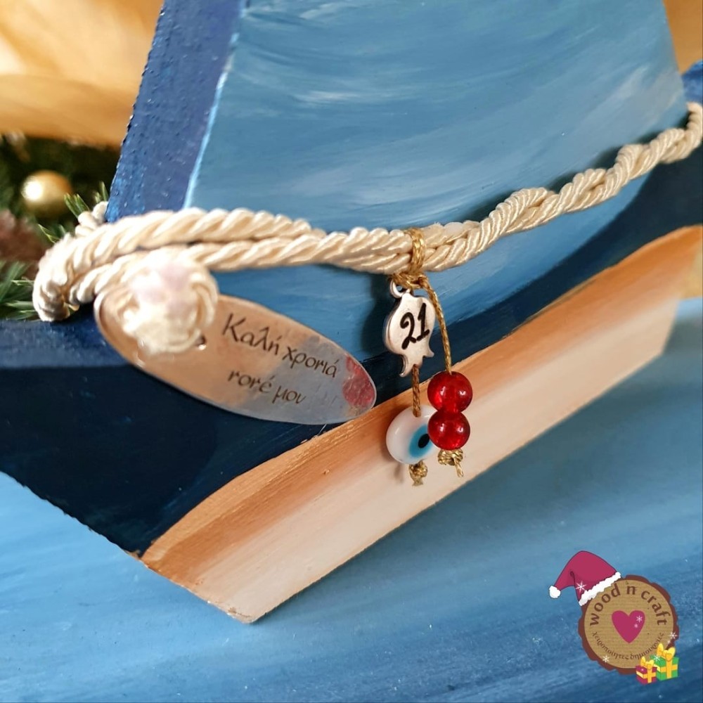 Ξύλινο χειροποίητο διακοσμητικό γούρι καράβι ζωγραφισμένο στο χέρι και διακοσμημένο με κορδόνι, μεταλλικό ρόδι με τη νέα χρονιά, κρεμαστό ματάκι, χάντρες και μεταλλική πλακέτα χαραγμένη με την δική σας μοναδική αφιέρωση!