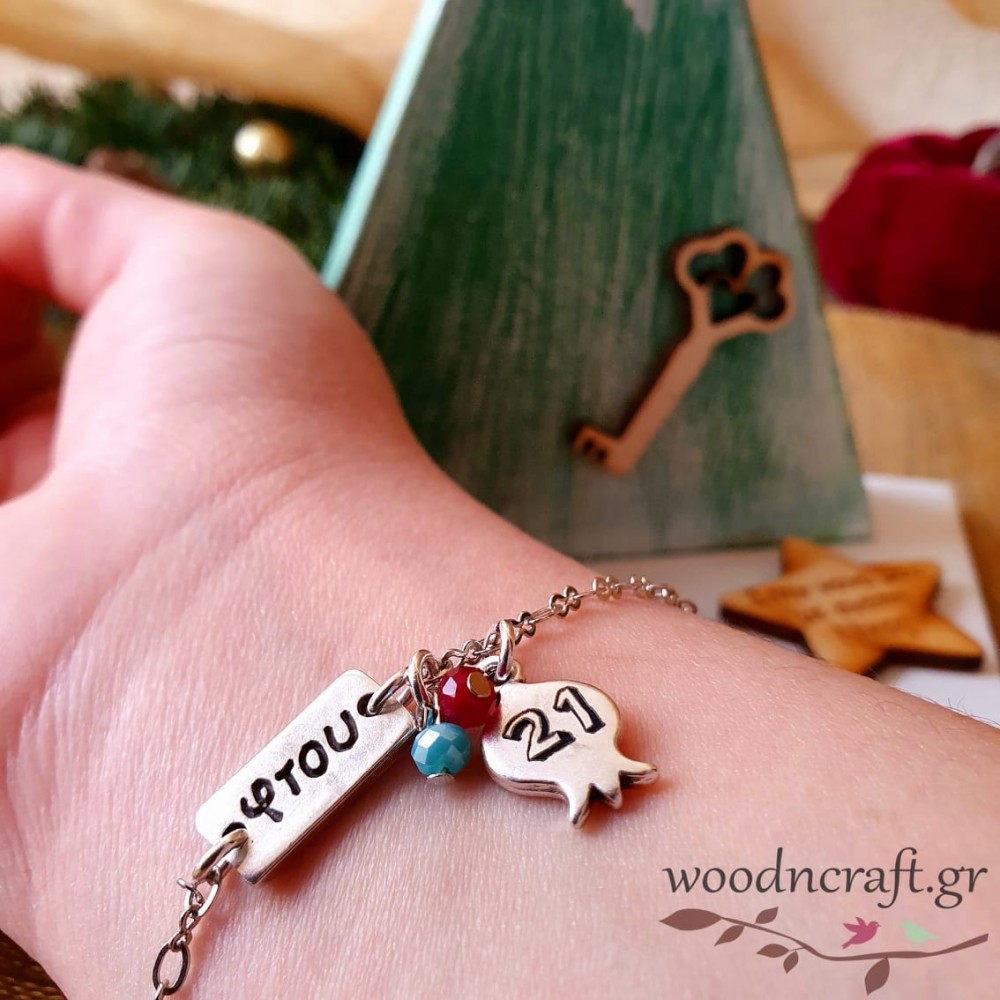 Βραχιόλι με αλυσίδα μεταλλικό ταμπελάκι φτου, κρεμαστό μεταλλικό ρόδι χαραγμένο με το νέο έτος και κρυσταλλάκια. (17 cm. με προέκταση αλυσιδίτσα)