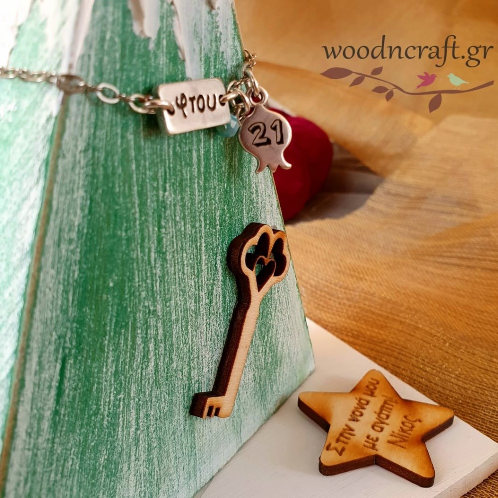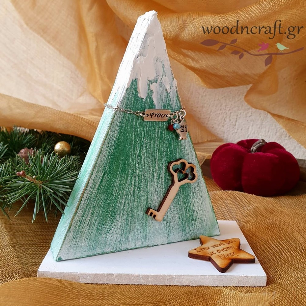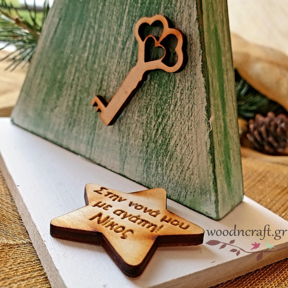 Πρωτότυπο, χειροποίητο ξύλινο γούρι - έλατο.. με ένα κλειδί και αστεράκι με αφιέρωση σε σετ με ένα ξεχωριστό τυχερό βραχιολάκι της επιλογής σας για ένα όμορφο και καλότυχο νέο έτος. Το δεντράκι μπορεί να χρωματιστεί σε απόχρωση της επιλογής σας και φυσικά στο αστεράκι μπορεί να χαραχτεί η δική σας αφιέρωση που θα κάνει το κάθε τυχερό δεντράκι μοναδικό και ξεχωριστό!