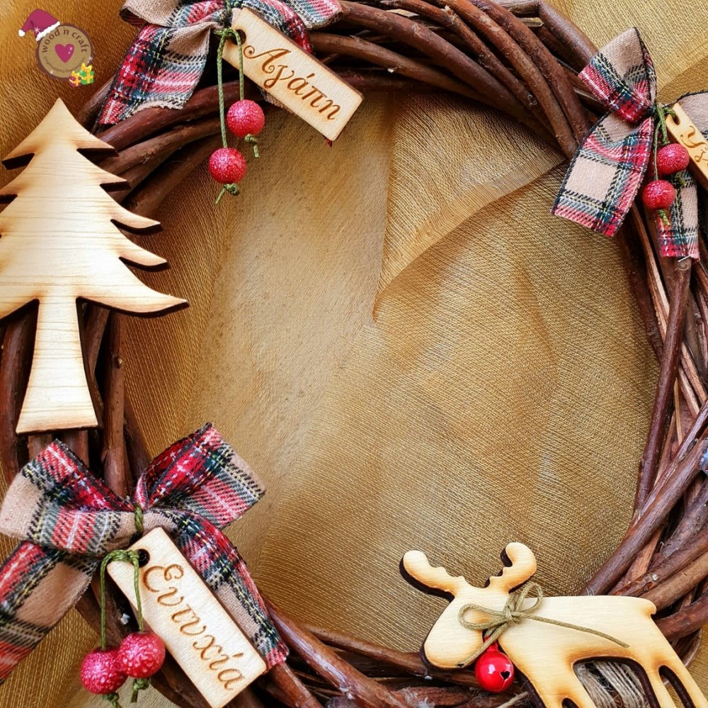 Πρωτότυπο και ξεχωριστό ξύλινο πλεχτό στεφάνι διακοσμημένο με ξύλινα στοιχεία, ταμπελάκια με ευχές και χριστουγεννιάτικα φιογκάκια με κρεμαστές χάντρες. Μια μοναδική χειροποίητη δημιουργία που σίγουρα θα εντυπωσιάσει!