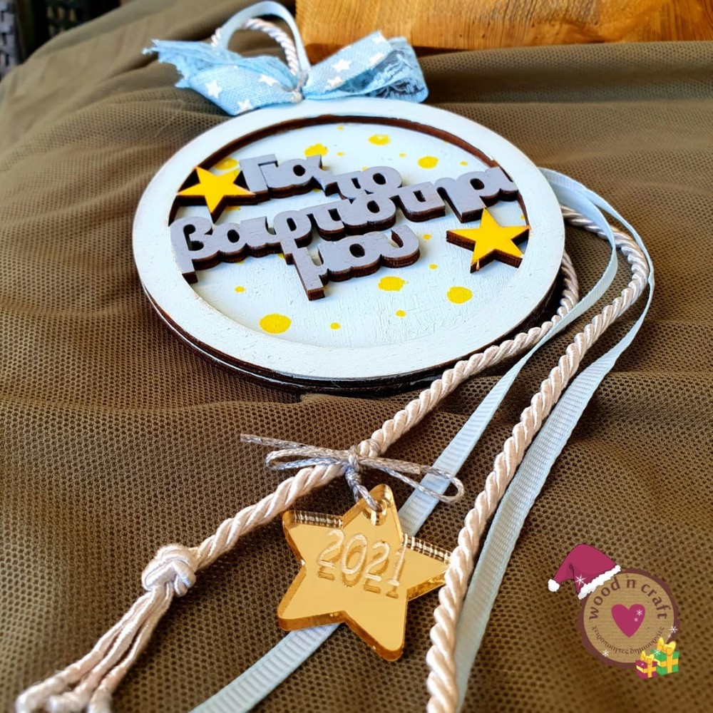 Ξύλινο χειροποίητο διακοσμητικό στολίδι αφιερωμένο στο βαφτιστήρι, διακοσμημένο με κορδόνι, κορδελάκια και κρεμαστό αστεράκι από χρυσό καθρέφτη χαραγμένο με τη νέα χρονιά!