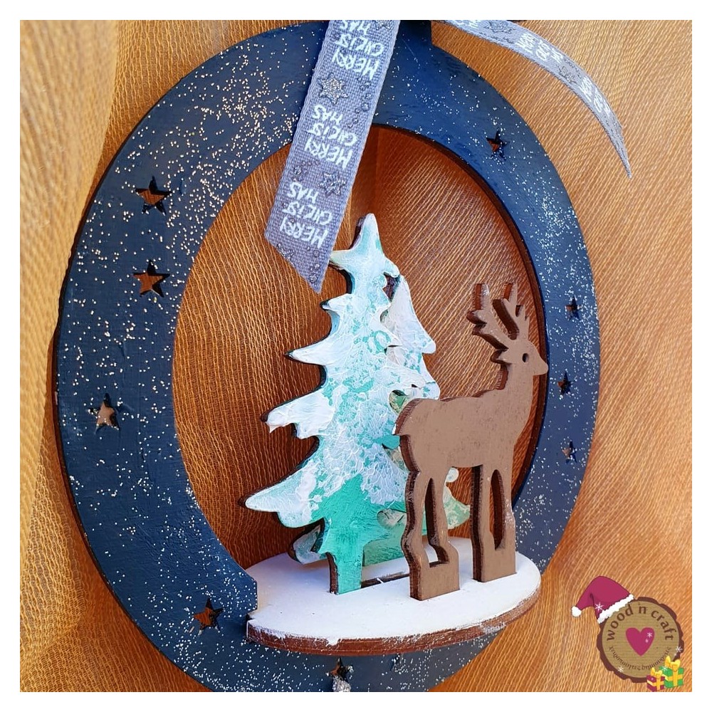 Χειροποίητο τρισδιάστατο χριστουγεννιάτικο στολίδι γεμάτο μαγεία... Δύο χιονισμένα έλατα και ένα ελάφι, προσαρμοσμένα σε ξύλινο χριστουγεννιάτικο στεφανάκι με κοπτικά αστεράκια και γεμάτο ασημόσκονη. Διακοσμημένο με κορδέλα merry christmas και κρεμαστό αστεράκι χαραγμένο με αφιέρωση στα αγαπημένα σας άτομα!