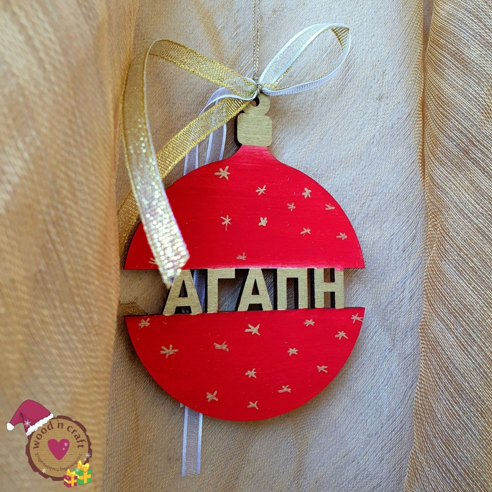 Ξύλινο χειροποίητο στολίδι σε στυλ χριστουγεννιάτικη μπάλα κομμένη στην μέση και με προσαρμοσμένη την λέξη αγάπη... Με αγάπη για τα μοναδικά αγαπημένα σας πρόσωπα! Βαμμένο στα χρώματα της επιλογής σας και διακοσμημένο με κορδελάκια.