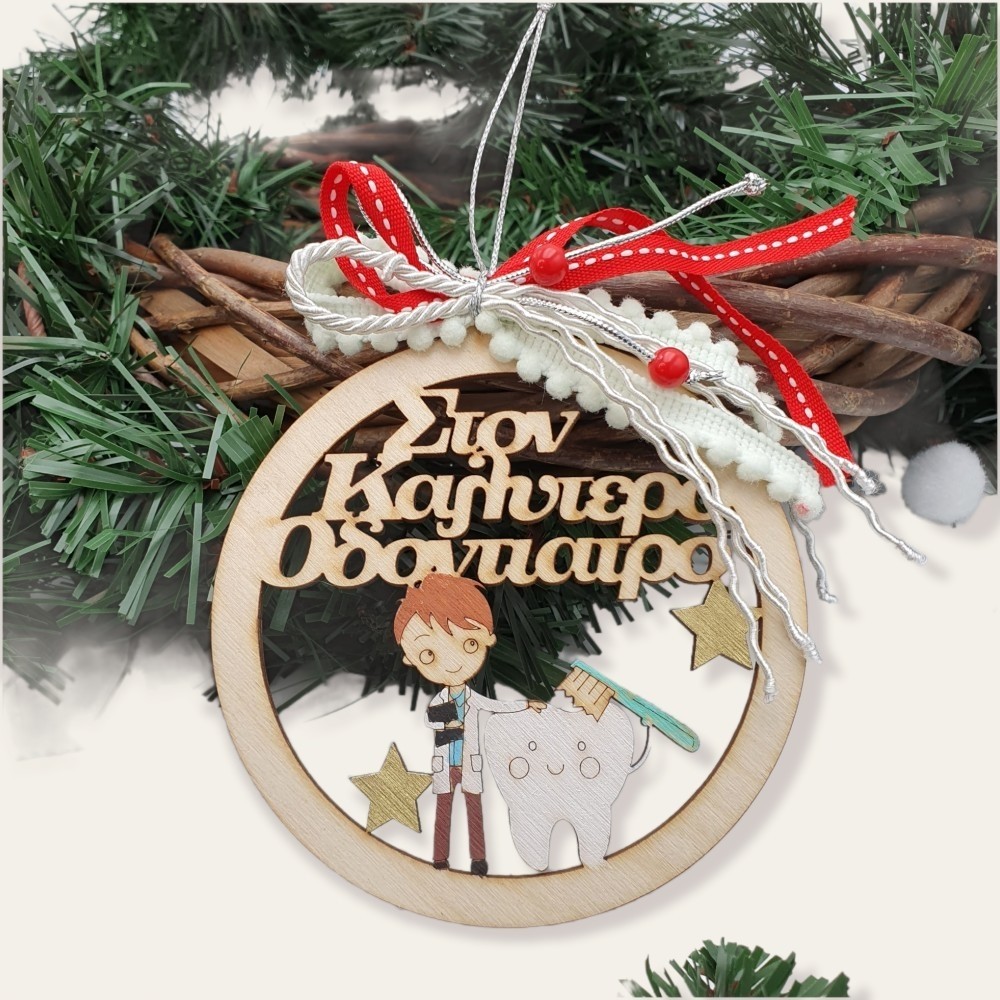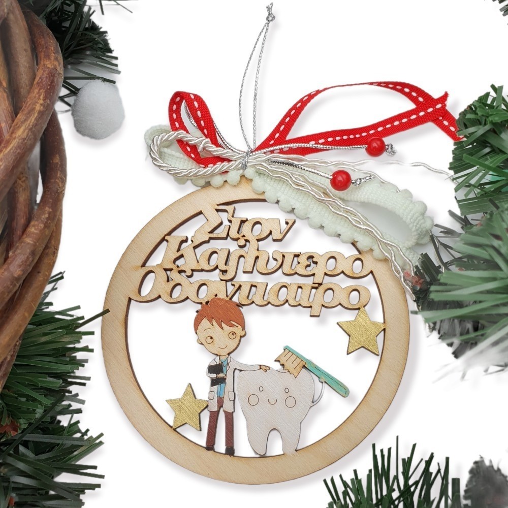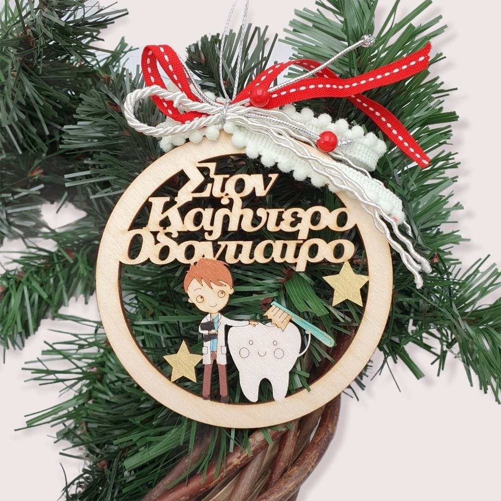 Ξύλινο χειροποίητο χριστουγεννιάτικο στολίδι σε σχήμα μπάλας με προσαρμοσμένη αναπαράσταση και αφιέρωση για τον καλύτερο οδοντίατρο! Διακοσμημένο με κορδόνι, κορδέλα, κερωμένα νήμα και χάντρες!