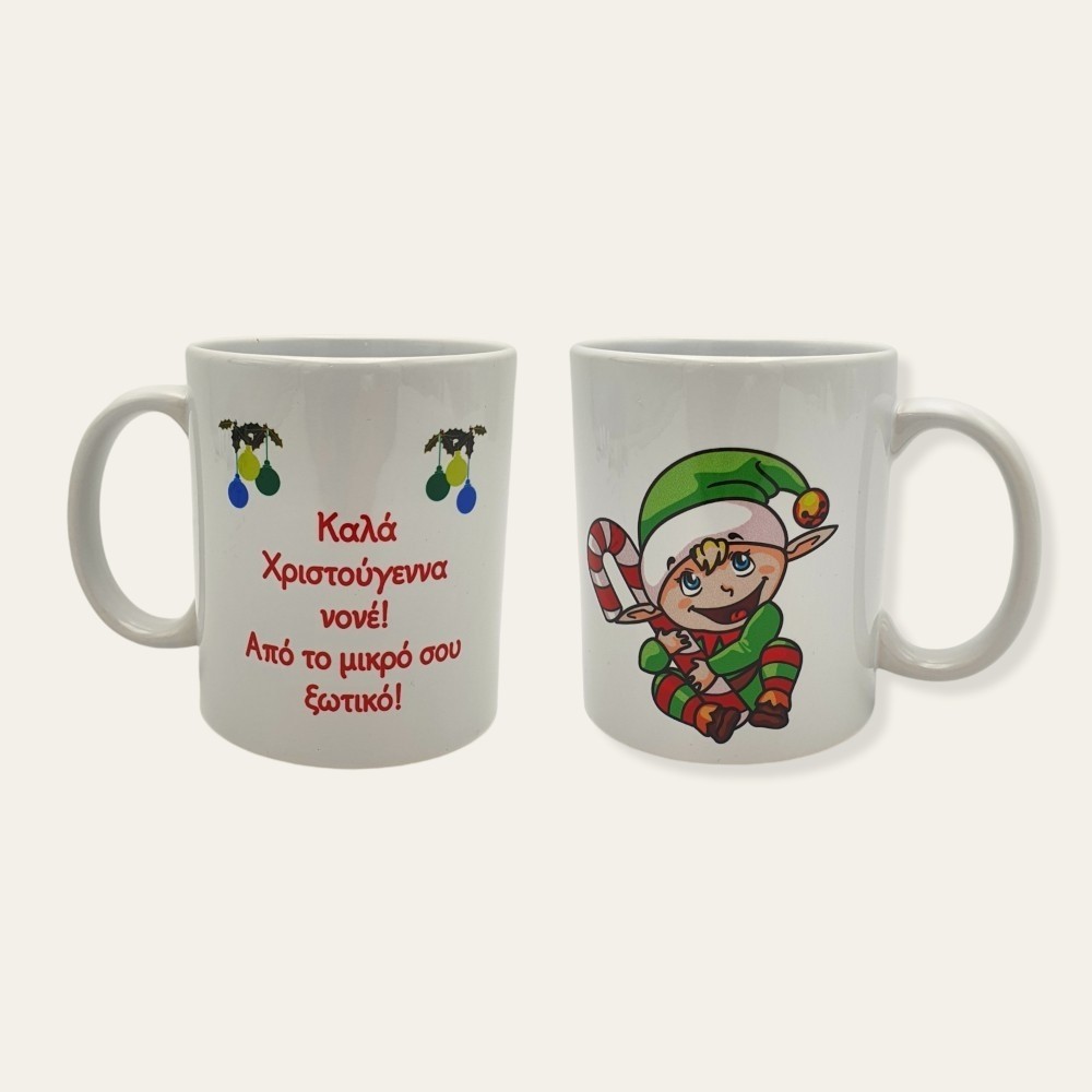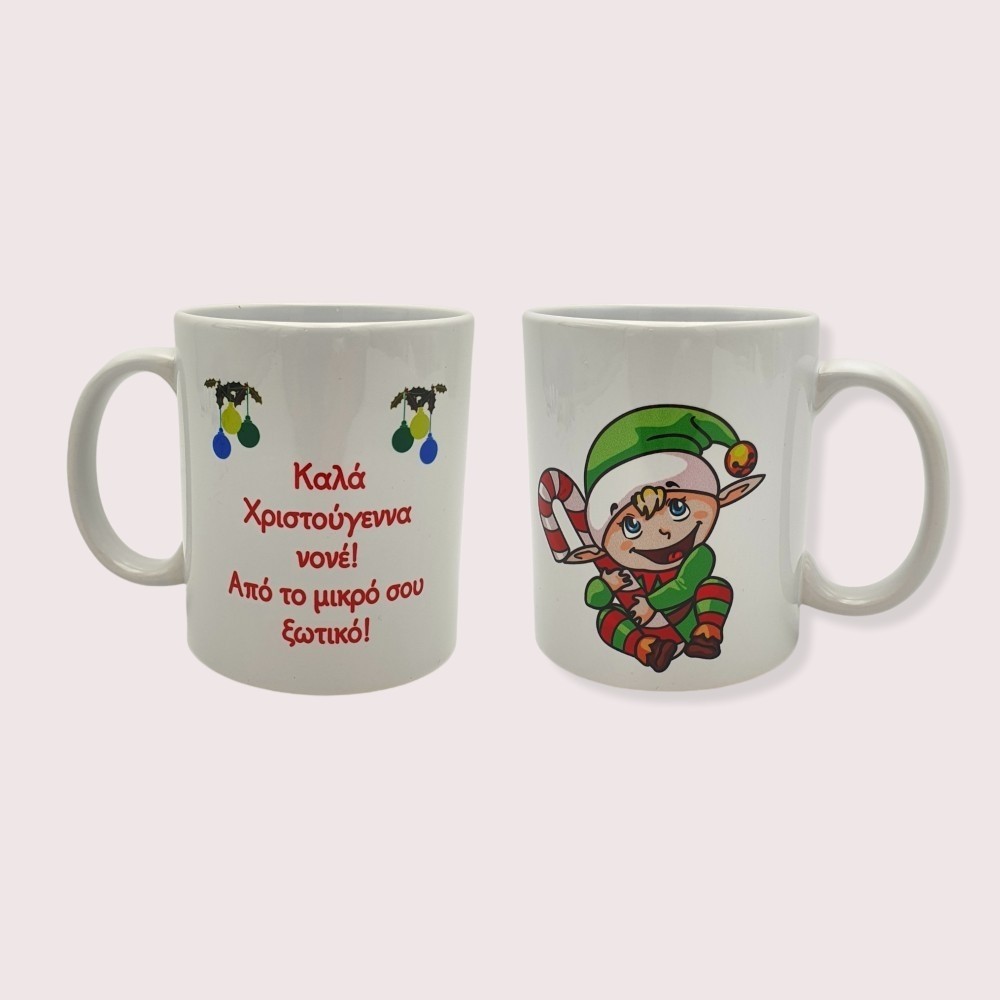 Μοναδική κούπα από λευκή πορσελάνη με τυπωμένη αφιέρωση απο το μικρό σας ξωτικό! Από την άλλη μεριά της κούπας κρύβεται το μικρό σας ξωτικό με ένα γλειφιτζούρι στην αγκαλιά του.