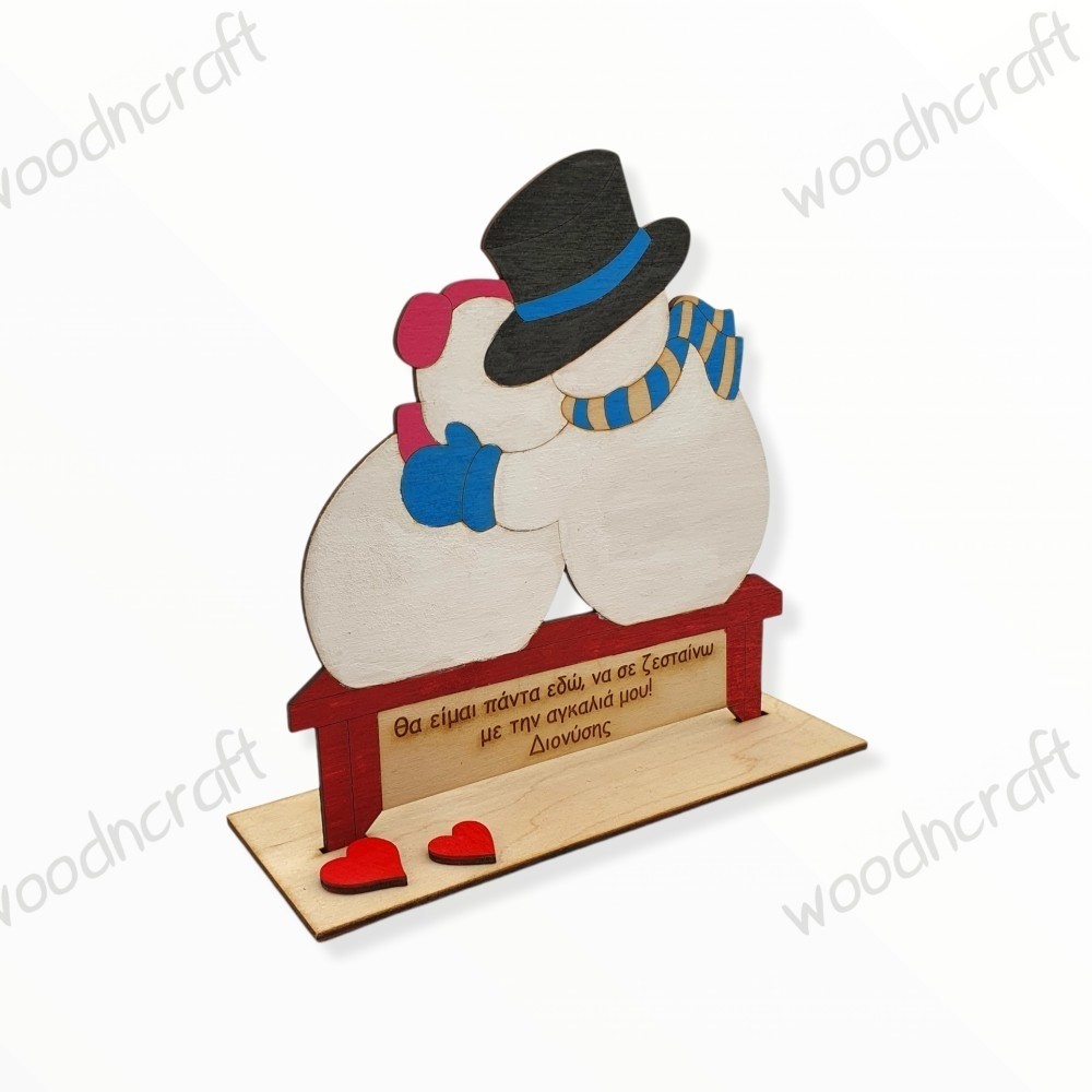 Πρωτότυπο ξύλινο χειροποίητο σταντάκι με ένα ζευγάρι αγκαλιασμένους χιονάνθρωπους σε ένα παγκάκι και από κάτω η αφιέρωση της επιλογής σας και διακοσμημένο με 2 καρδούλες!