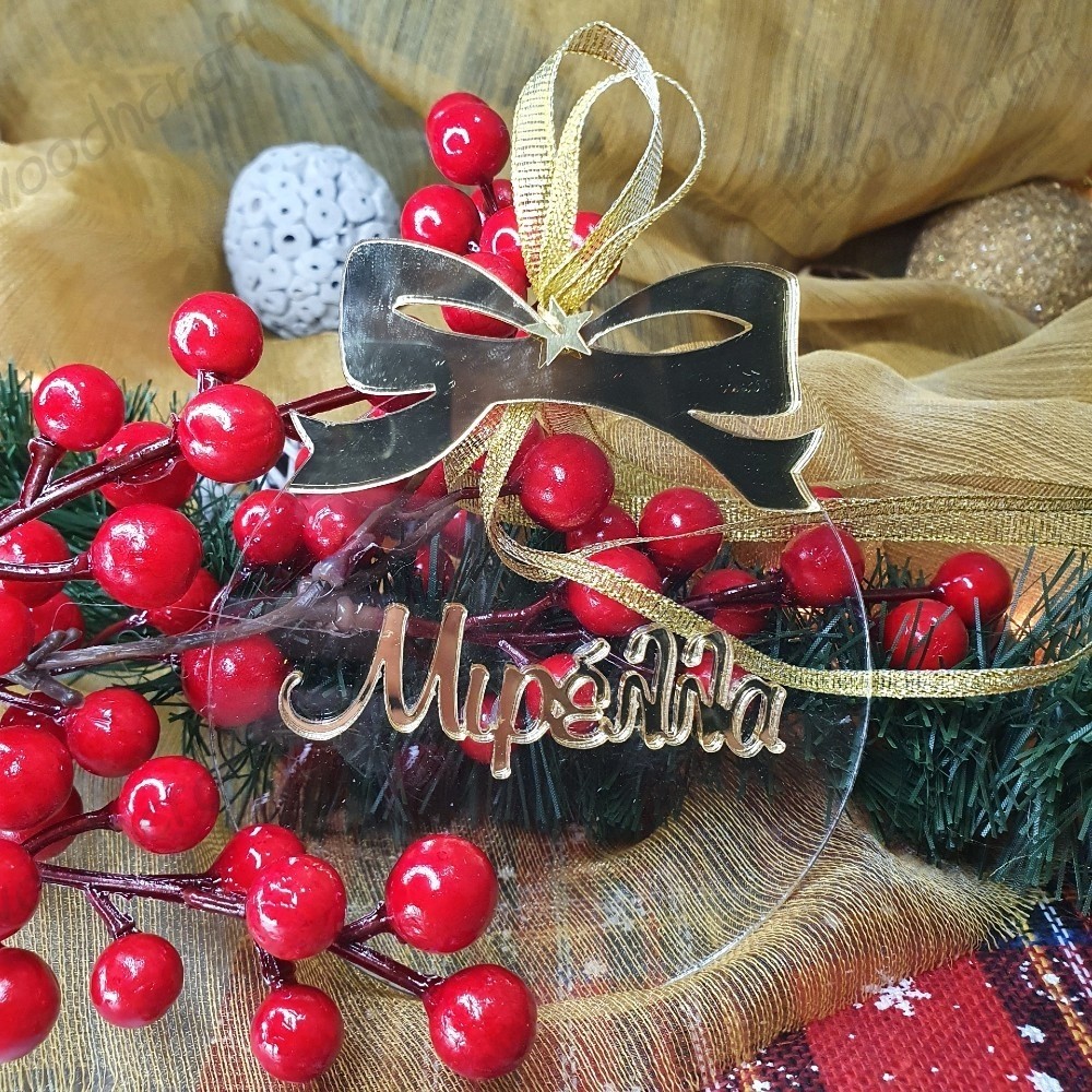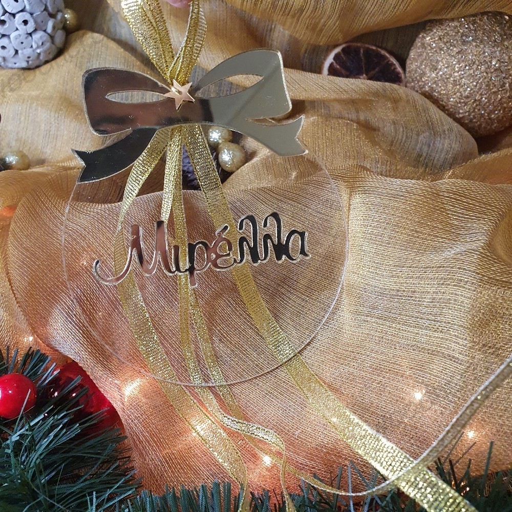 Μοναδικό χειροποίητο χριστουγεννιάτικο στολίδι από διάφανο και χρυσό καθρέφτη πλεξιγκλάς, με φιογκάκι και το όνομα της επιλογής σας! Διακοσμημένο με κορδέλα. Ένα ξεχωριστό προσωποποιημένο στολίδι που θα κλέψει τις εντυπώσεις!