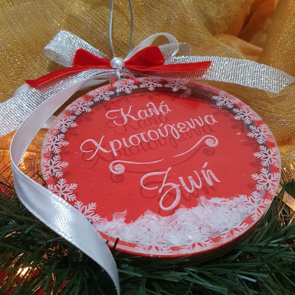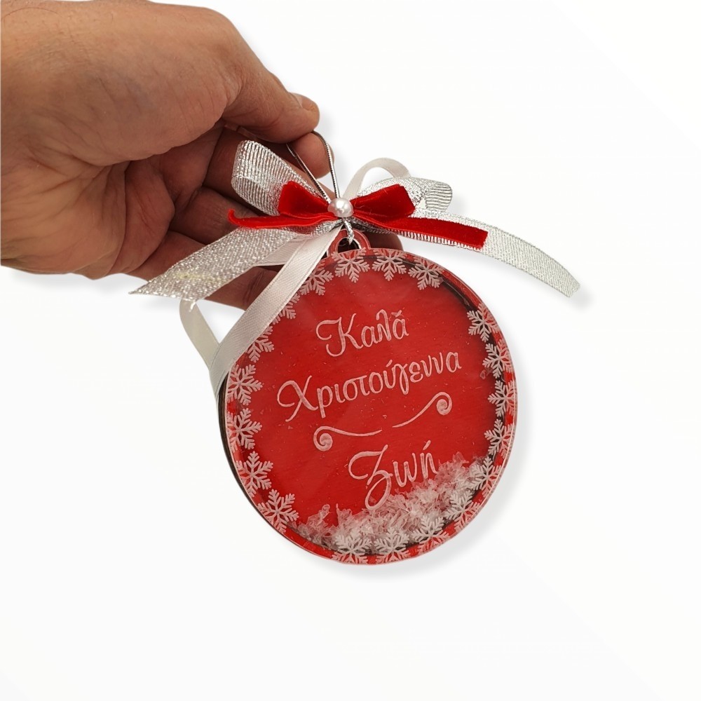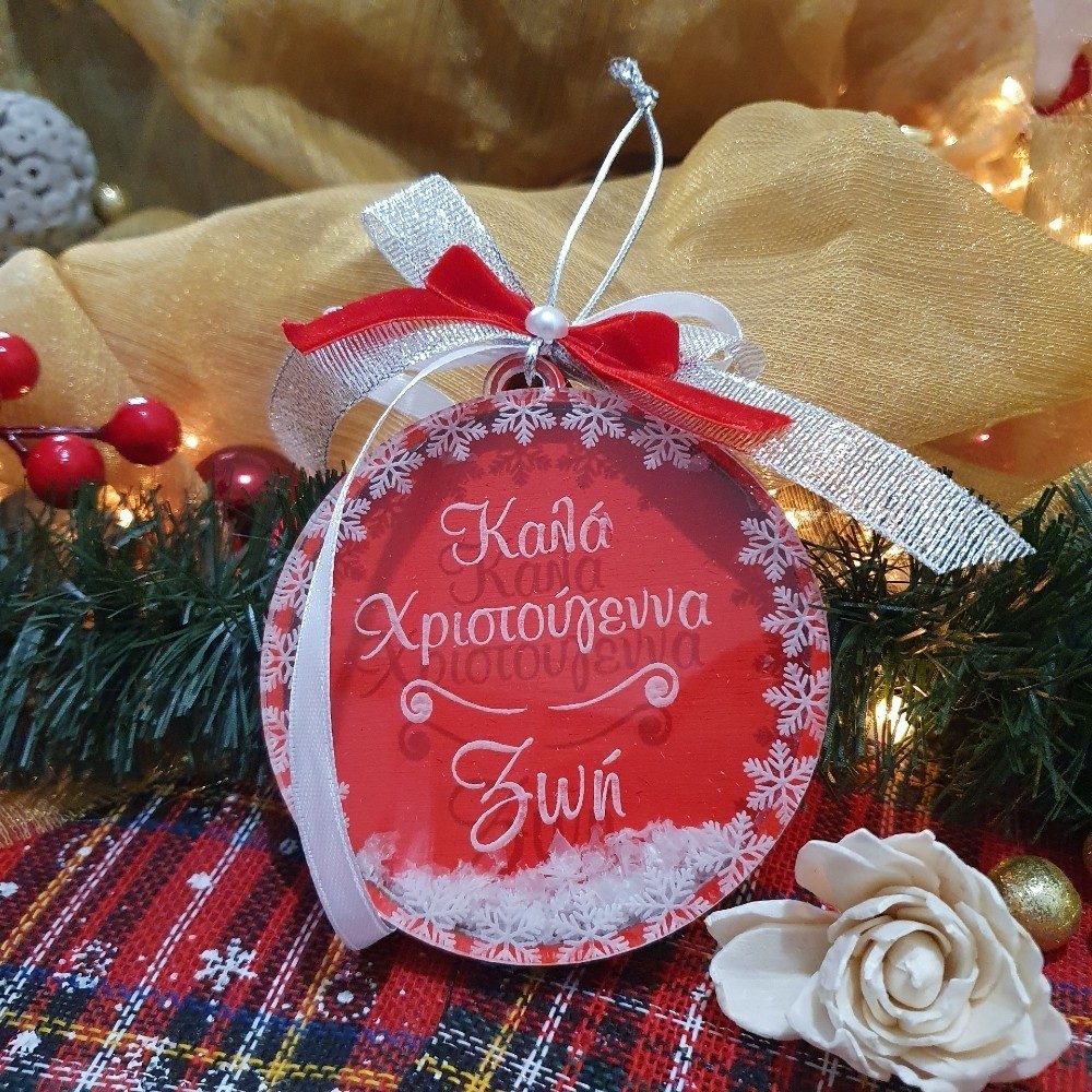 Μοναδικό χειροποίητο χριστουγεννιάτικο στολίδι φτιαγμένο από ξύλο το οποίο μπορεί να βαφεί στο χρώμα που θέλετε και διάφανο πλεξιγκλάς χαραγμένο με νιφάδες χιονιού, ευχή για καλά Χριστούγεννα και φυσικά το όνομα της επιλογής σας! Στο εσωτερικό του στολιδιού υπάρχει διακοσμητικό χιόνι ενώ εξωτερικά είναι διακοσμημένο με κορδελάκια και πέρλα!