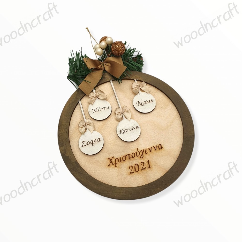 Μοναδικό ξύλινο χειροποίητο καδράκι σε σχήμα χριστουγεννιάτικης μπάλας διακοσμημένο με στολισμένη γιρλάντα και χρυσό κορδελάκι. Στο εσωτερικό της μπάλας υπάρχουν μικρότερες προσαρμοσμένες μπάλες χαραγμένες με τα ονόματα της επιλογής σας και από κάτω τα φετινά Χριστούγεννα!