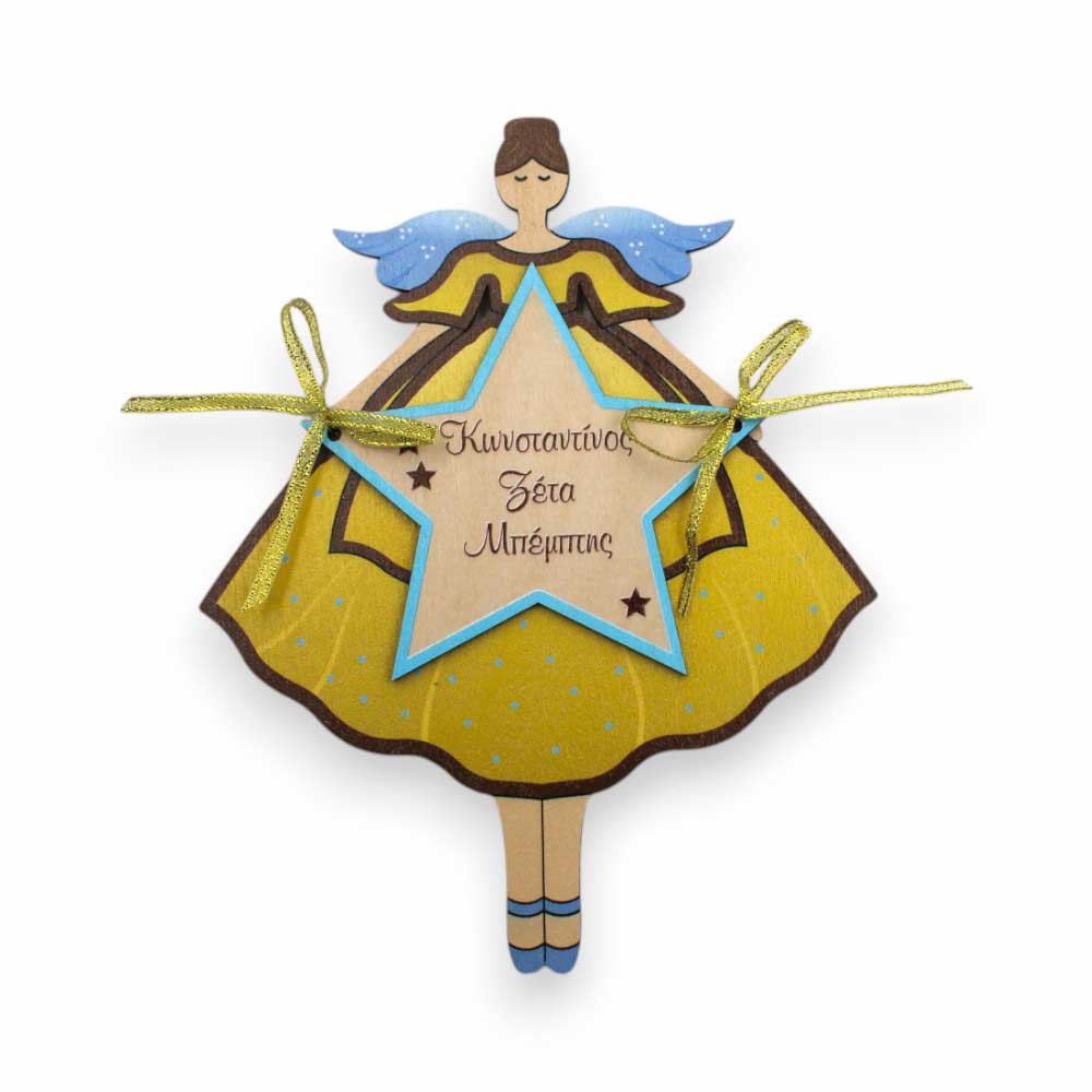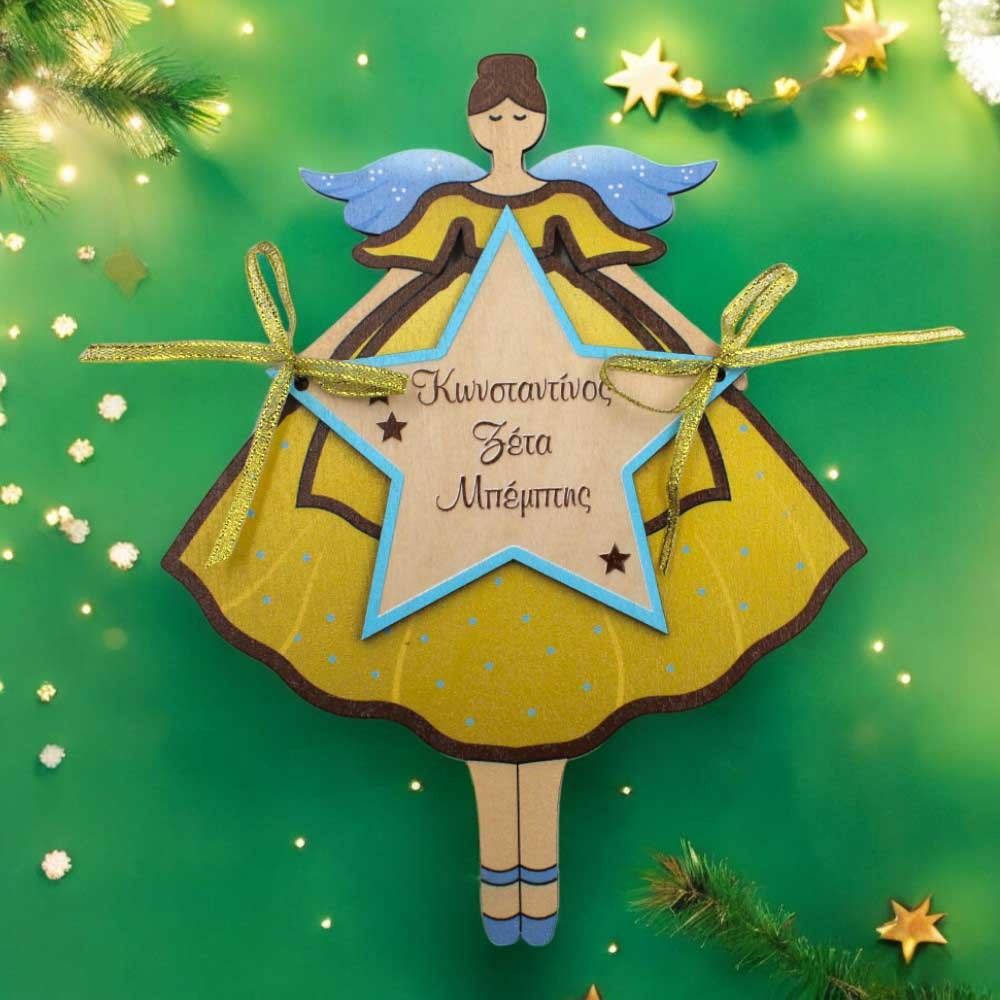 Μοναδικό ξύλινο χειροποίητο διακοσμητικό για να διακοσμήσετε την κορυφή του Χριστουγεννιάτικου δέντρου, σε σχήμα αγγέλου με ένα αστέρι στην αγκαλιά χαραγμένο με τα ονόματα της δικής σας οικογένειας!