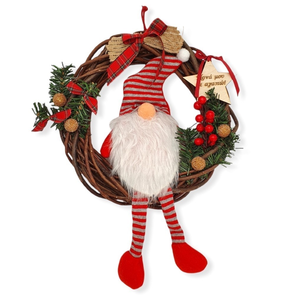 Ξεχωριστό και μοναδικό ξύλινο πλεχτό στεφάνι διακοσμημένο με ένα κουκλάκι gnome, χριστουγεννιάτικη σύνθεση με γιρλάντα, διακοσμητικές μπαλίτσες και κορδελάκια, και ένα ξύλινο αστέρι χαραγμένο με την αφιέρωση της επιλογής σας! Μια πρωτότυπη χειροποίητη δημιουργία που σίγουρα θα εντυπωσιάσει!