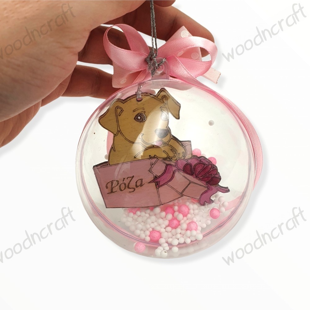 Ξεχωριστή χριστουγεννιάτικη διάφανη μπάλα στο εσωτερικό της διακοσμημένη με ξύλινο διακοσμητικό κουταβάκι μέσα σε ένα κουτί δώρου χαραγμένο με το όνομά του και διακοσμητικές μπαλίτσες χιονιού και εξωτερικά τυλιγμένη με κορδέλα και στολισμένη με φιογκάκια!