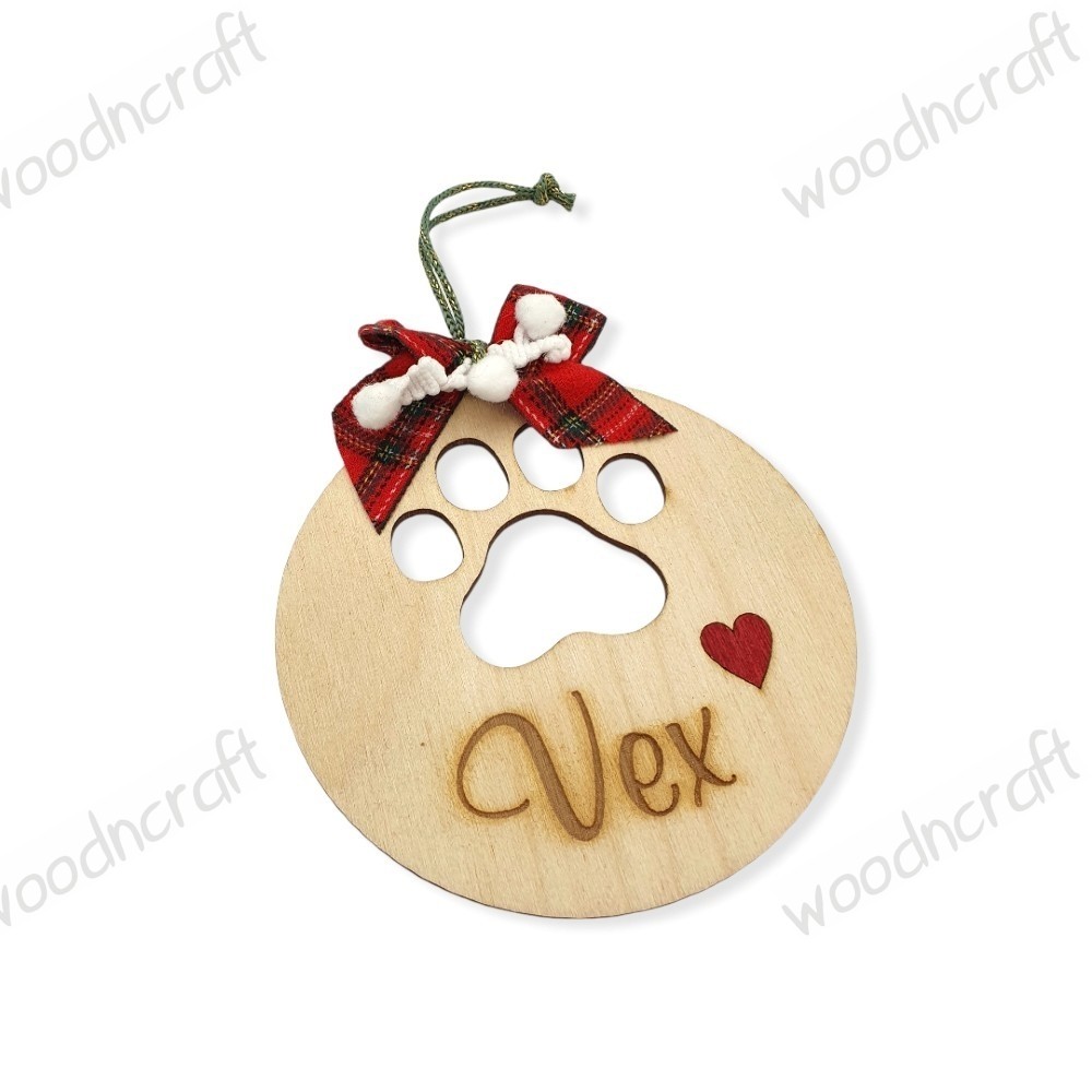 Ξύλινο χειροποίητο στολίδι σε σχέδιο χριστουγεννιάτικης μπάλας με διάτρητο πατουσάκι γάτας, χαραγμένη καρδούλα και φυσικά το όνομα της επιλογής σας! Ένα ξεχωριστό διακοσμητικό στολίδι για το αγαπημένο σας κατοικίδιο διακοσμημένο με χριστουγεννιάτικα κορδελάκια.