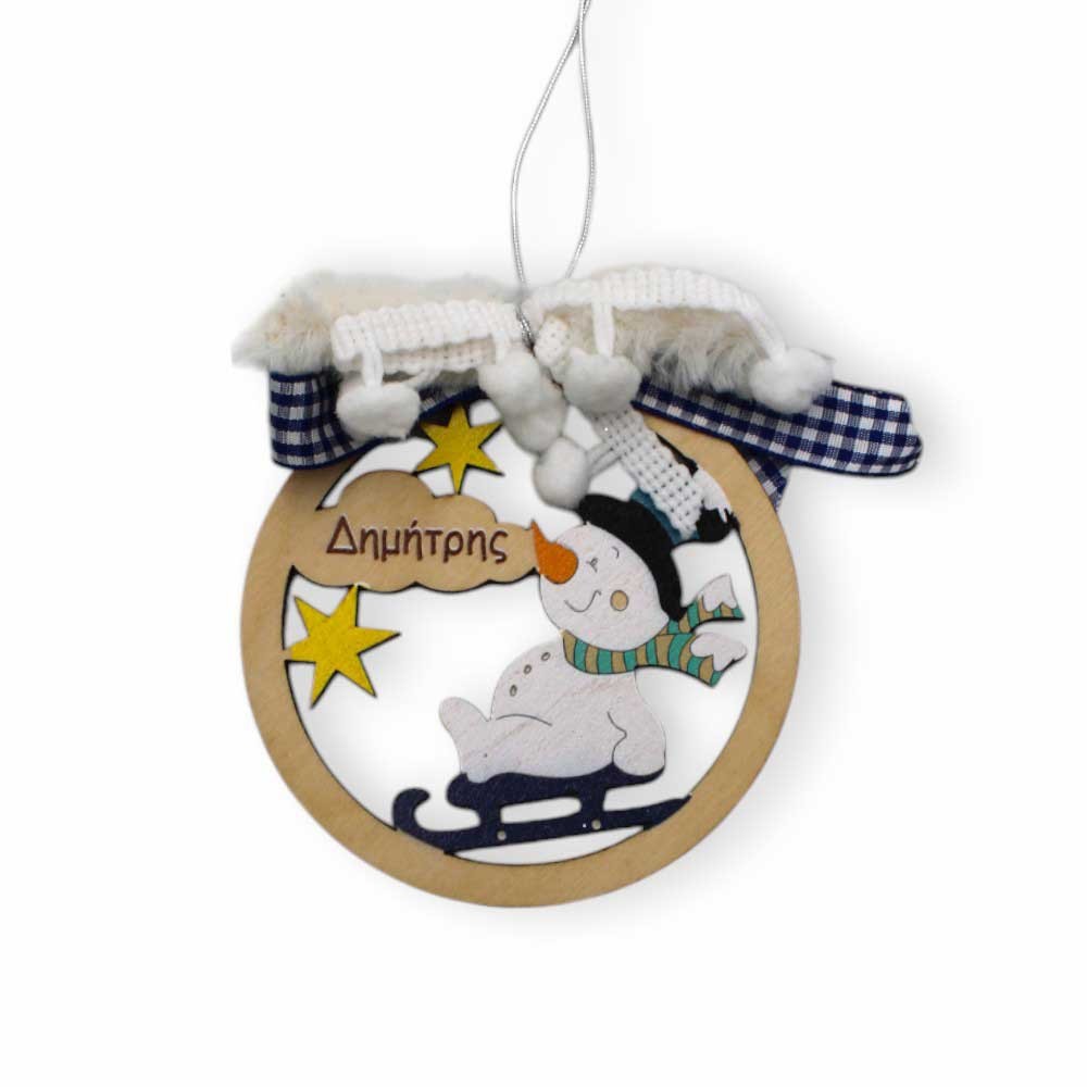 Μοναδικό ξύλινο χειροποίητο στολίδι σε σχήμα χριστουγεννιάτικης μπάλας με προσαρμοσμένο ένα χιονάνθρωπο στο εσωτερικό της, 2 αστεράκια και ένα σύννεφο χαραγμένο με το όνομα της επιλογής σας! Διακοσμημένο με πλούσια κορδελάκια!