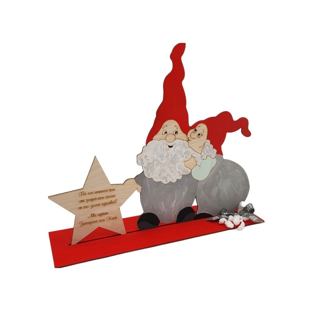 Χριστουγεννιάτικο ξύλινο διακοσμητικό σε βάση, με έναν παππού και μία γιαγιά αγκαλιασμένους και ντυμένους με χριστουγεννιάτικο σκουφάκι... και χαραγμένη αφιέρωση της επιλογής σας σε ένα προσαρμοσμένο αστεράκι!