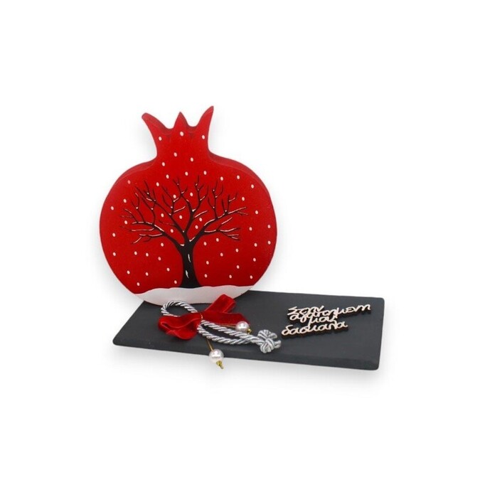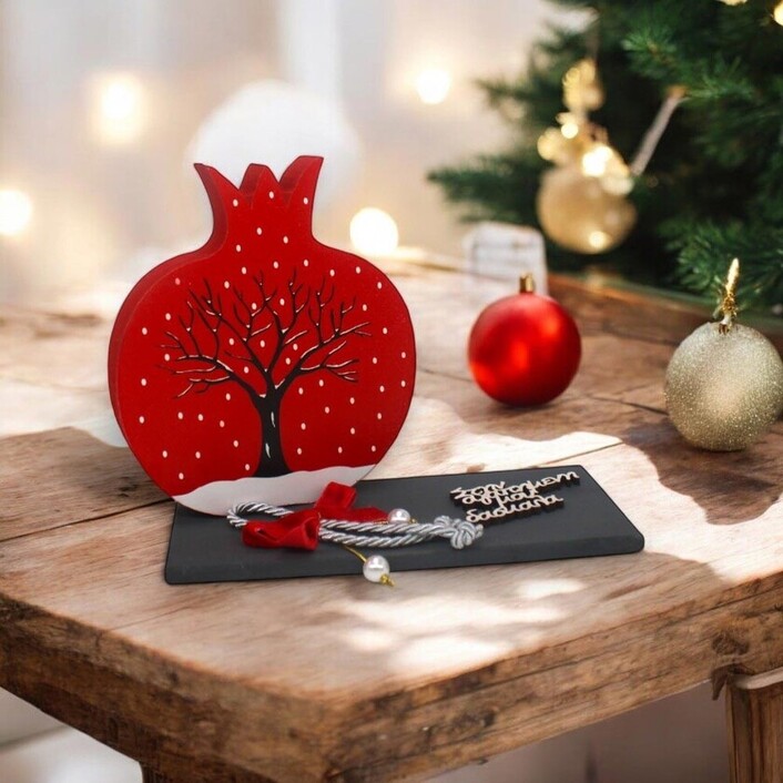 Ιδιαίτερο και ξεχωριστό ξύλινο γούρι σε σχήμα ροδιού με εκτυπωμένη παράσταση ένα χιονισμένο δέντρο τοποθετημένο σε βάση διακοσμημένη με κορδόνι, φιογκάκι, πέρλες και την αφιέρωση της επιλογής σας!
