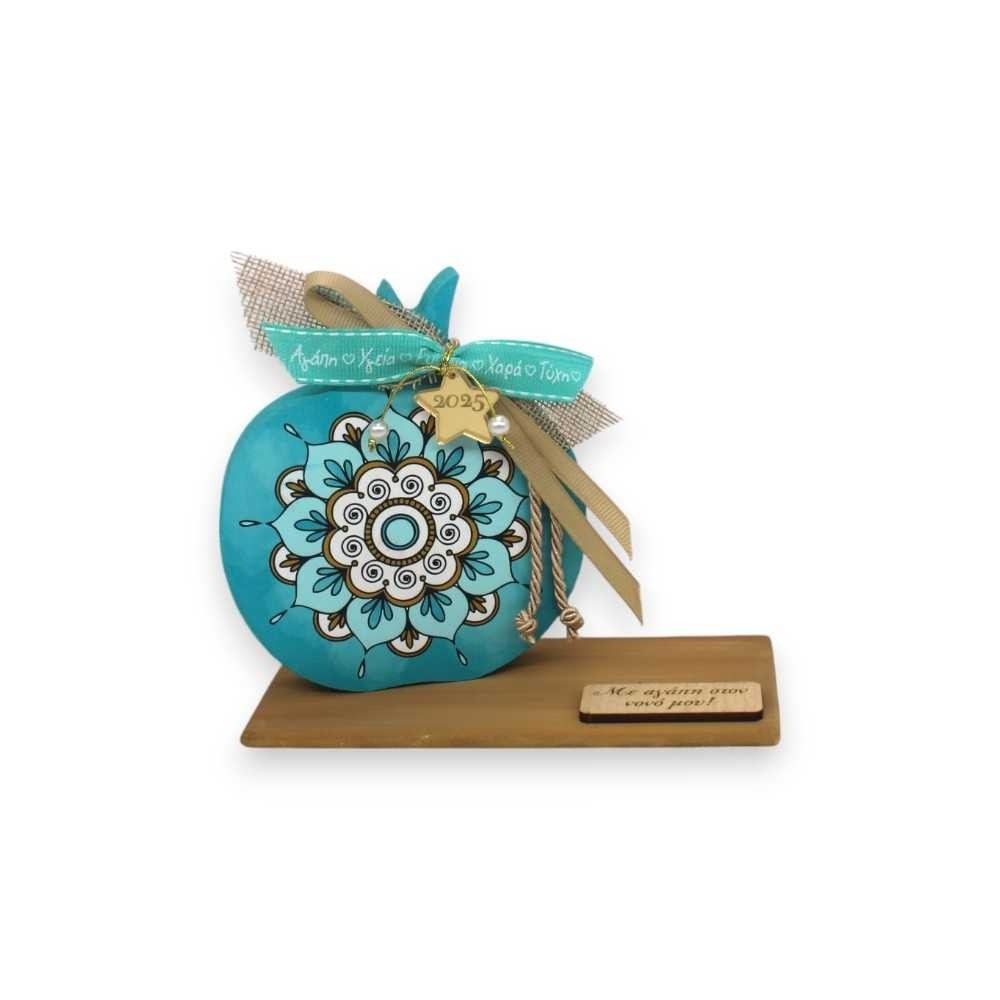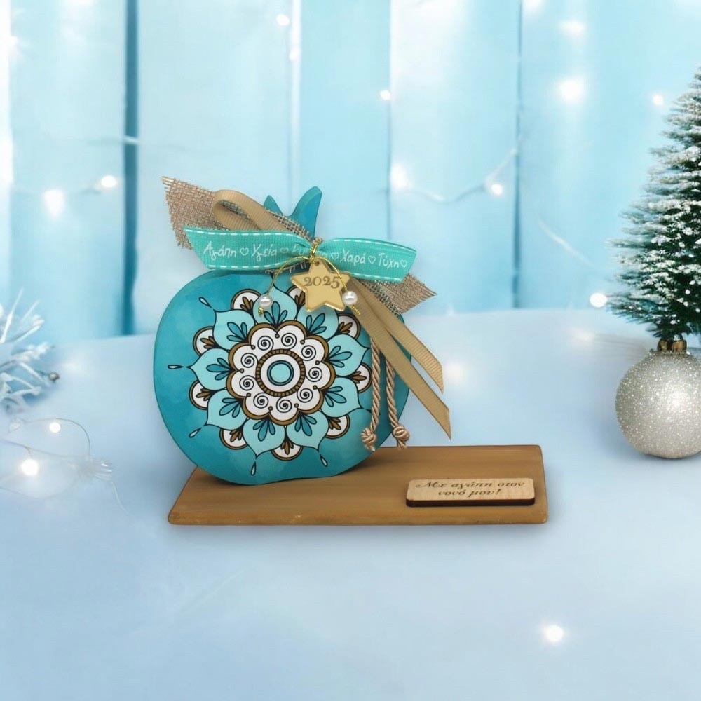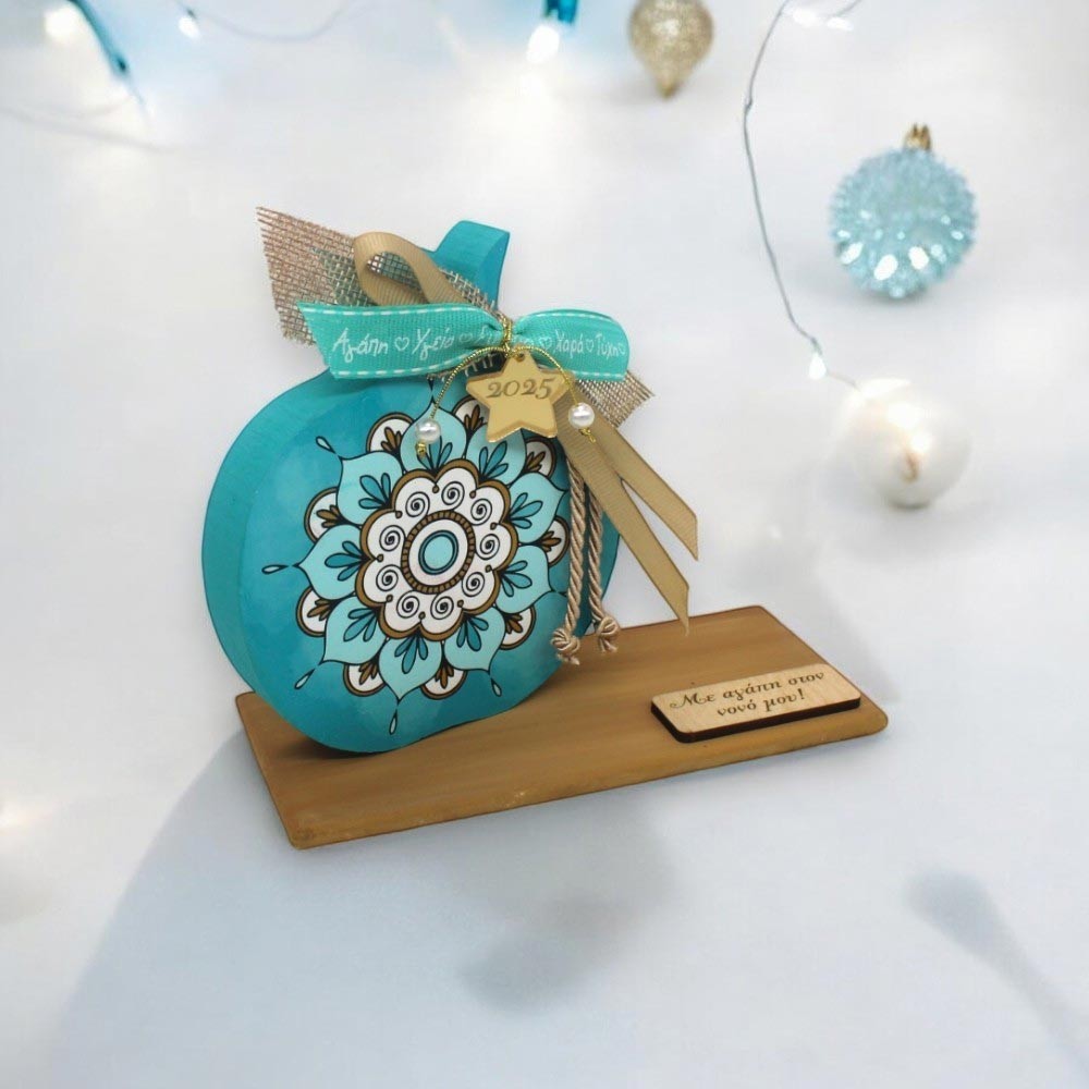 Ιδιαίτερο προσωποποιημένο γούρι υψηλής αισθητικής σε σχήμα ροδιού φτιαγμένο από χοντρό ξύλο, τοποθετημένο σε βάση διακοσμημένη με αστεράκι από χρυσό καθρέφτη πλεξιγκλάς χαραγμένο με τη νέα χρονιά, φιογκάκι, και ξύλινο ταμπελάκι χαραγμένο με την αφιέρωση της επιλογής σας!