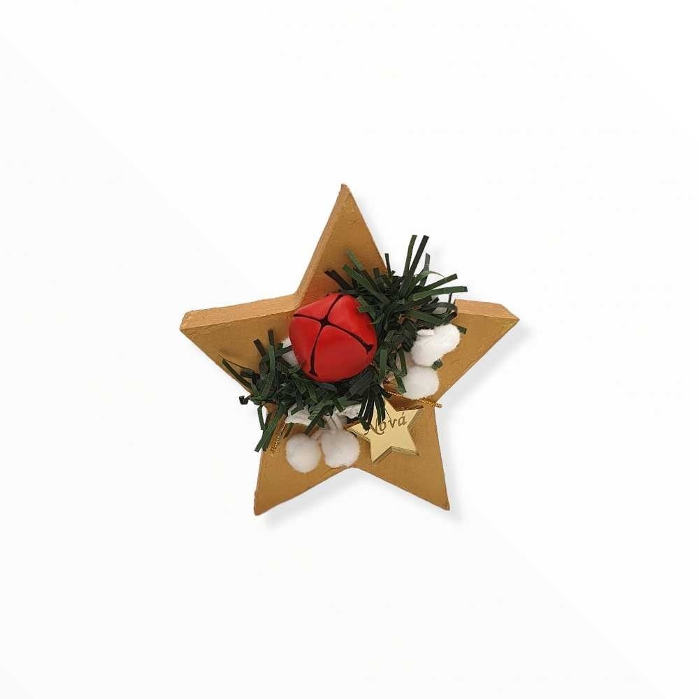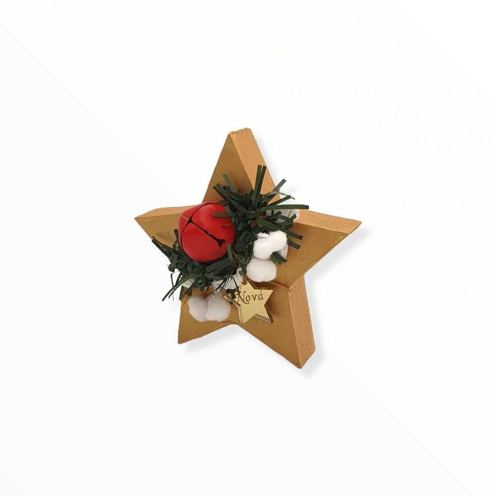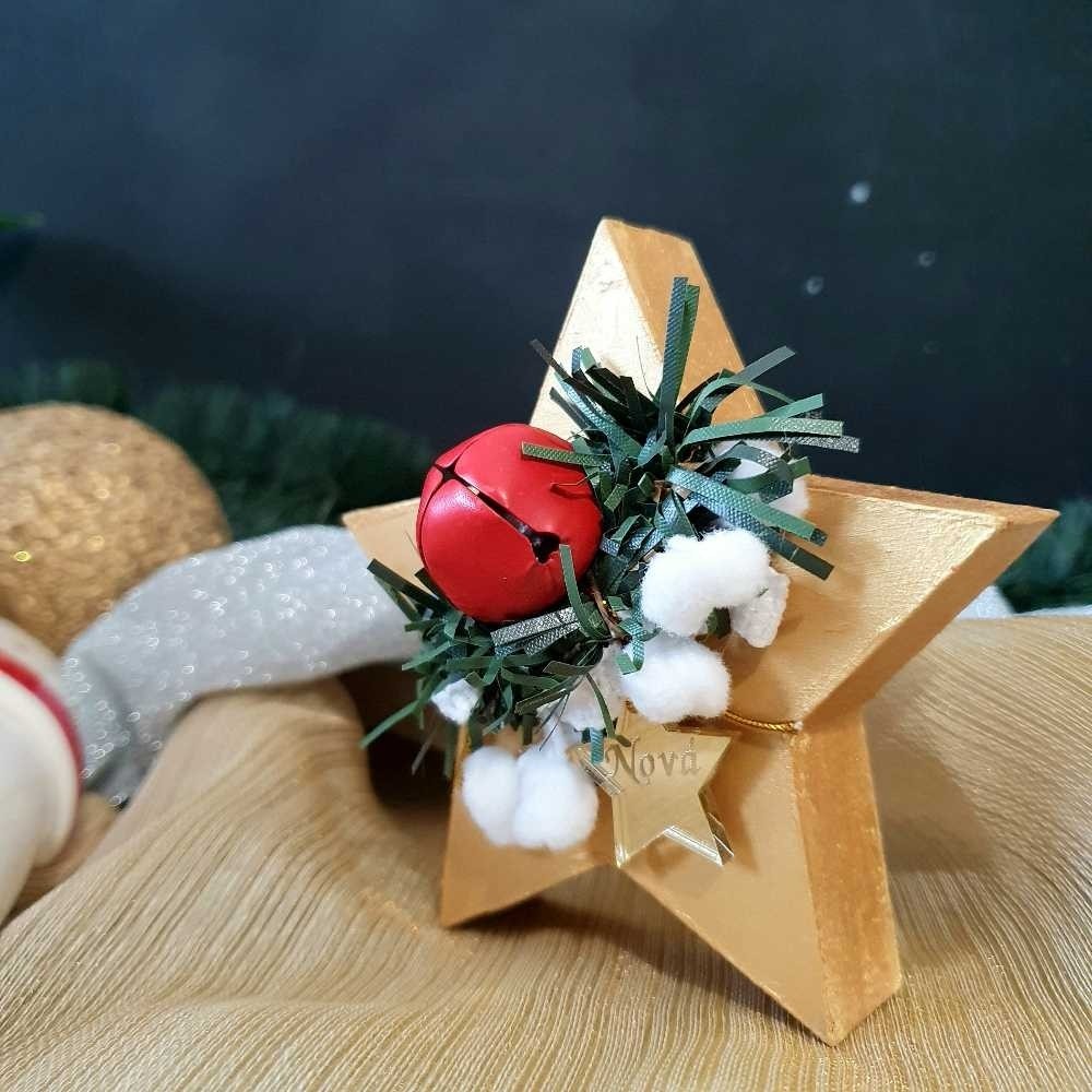 Ιδιαίτερο αυτοστηριζόμενο ξύλινο γούρι αστεράκι για να ομορφαίνει διακριτικά τον χώρο τον αγαπημένων σας! Βαμμένο στο χέρι και διακοσμημένο με γιρλάντα, μπαλίτσες χιονιού, χριστουγεννιάτικο κουδουνάκι και αστεράκι από χρυσό καθρέφτη πλεξιγκλάς με την δική σας χάραξη.
