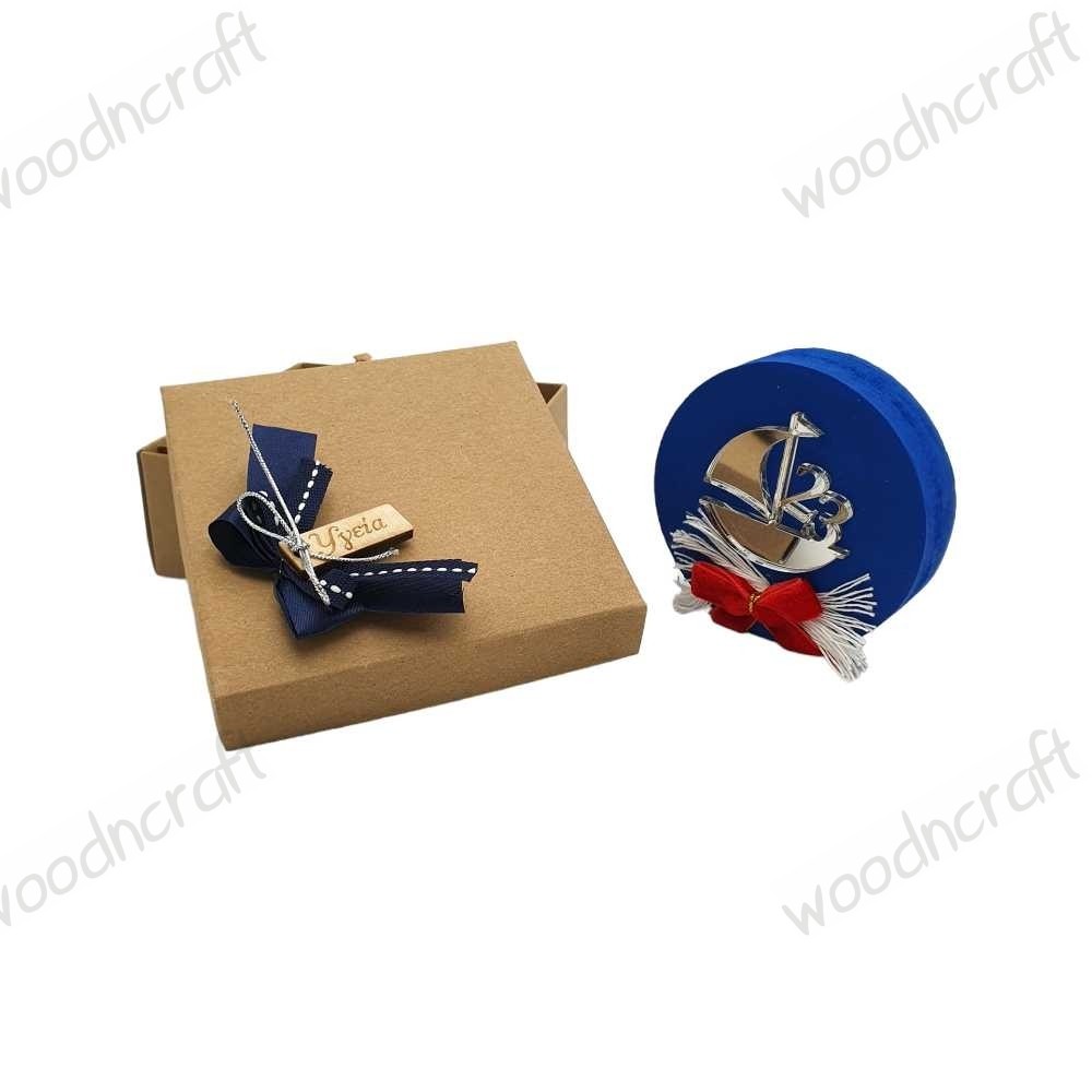 Χειροποίητο ξύλινο διακριτικό γούρι σε στρόγγυλο σχήμα διακοσμημένο με κορδελάκια και ένα καραβάκι 2023 φτιαγμένο με ασημί πλεξιγκλάς καθρέφτη!