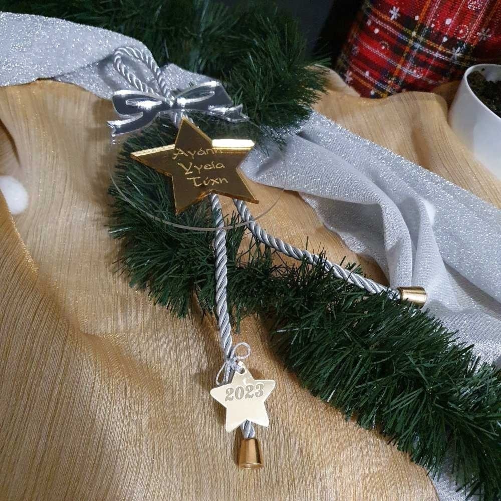 Πρωτότυπο χειροποίητο κρεμαστό γούρι υψηλής αισθητικής φτιαγμένο με πλεξιγκλάς (το φόντο με διάφανο, τα αστεράκια με χρυσό καθρέφτη και ο φιόγκος με ασημί καθρέφτη). Το μεγάλο αστέρι είναι χαραγμένο με τις ευχές "αγάπη, υγεία και τύχη" και το μικρό κρεμαστό αστεράκι είναι χαραγμένο με τη νέα χρονιά. Διακοσμημένο με χοντρό ασημί κορδόνι και μεταλλικές άκρες σε χρυσή απόχρωση!