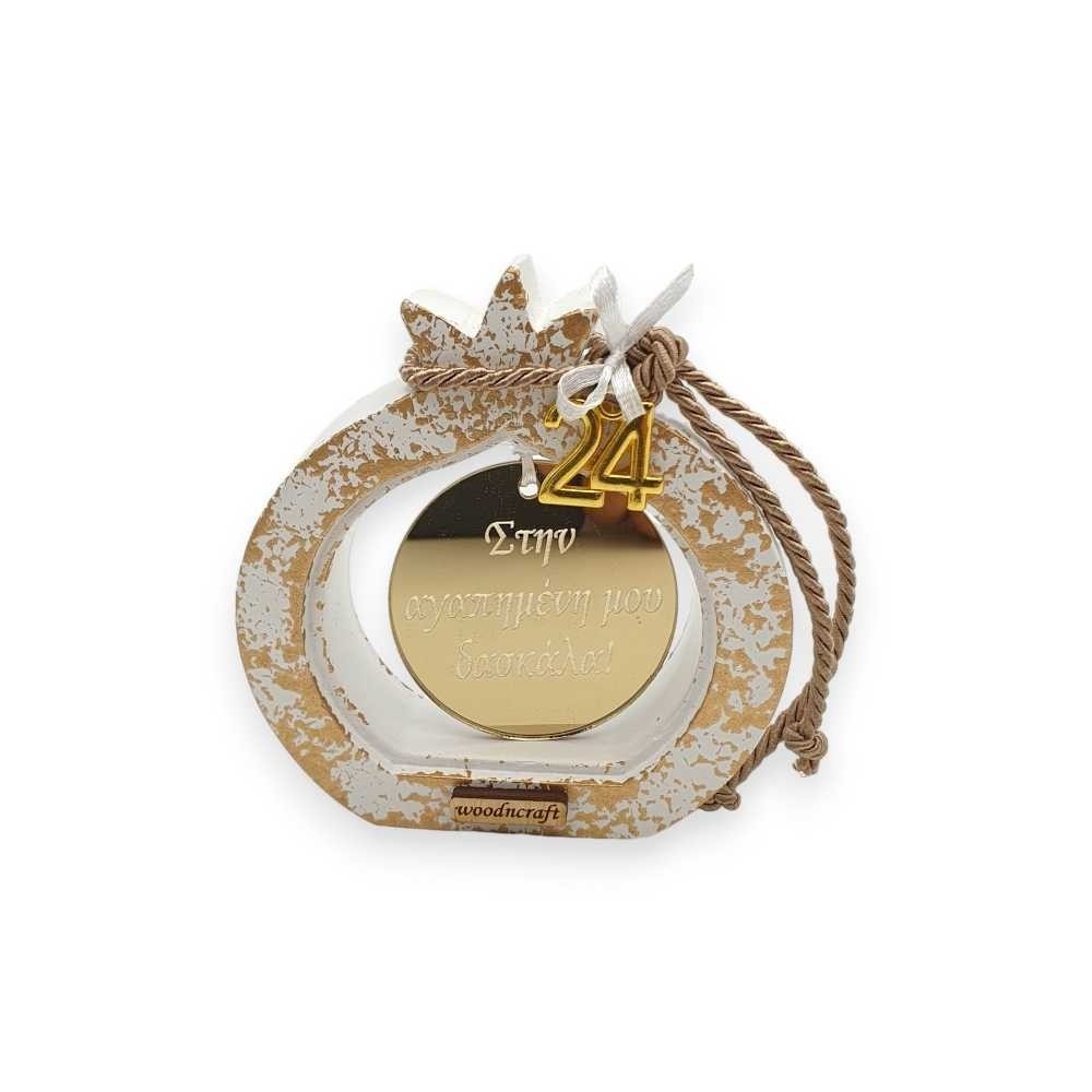 Ξεχωρίστε αυτές τις γιορτές προσφέροντας στα αγαπημένα σας πρόσωπα ένα μοναδικό γούρι. Αυτό το χειροποίητο κεραμικό ρόδι ξεχωρίζει για την αισθητική του αλλά και το μήνυμα που κρύβει. Είναι σχεδιασμένο σε υπέροχες αποχρώσεις λευκού και χρυσού, ενώ στο κέντρο του κρέμεται ένα χρυσό στρόγγυλο στοιχείο από καθρέφτη, χαραγμένο με αφιέρωση.