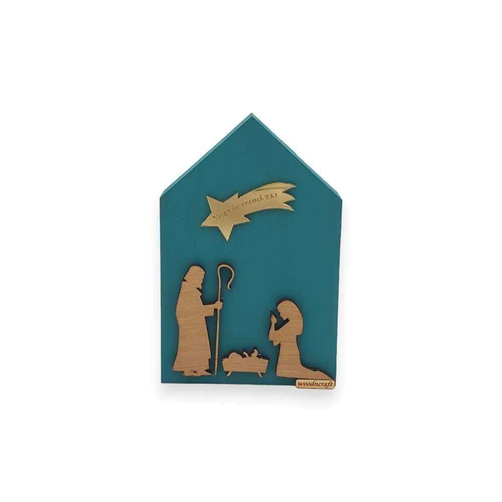 Σχεδιασμένο ως ένα ζεστό ξύλινο σπιτάκι, το κεντρικό τμήμα του διακοσμητικού απεικονίζει με μοναδικό τρόπο τη Φάτνη, με χειροποίητες ξύλινες φιγούρες του Ιωσήφ, της Παναγίας και του μικρού Χριστού να κοιμάται στο κρεβατάκι του.