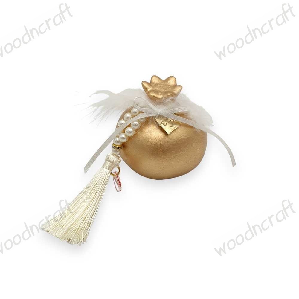 Εκφράζοντας την παράδοση με μοναδικό στυλ και κομψότητα, το "Golden Embrace" είναι ένας ονειρεμένος συνδυασμός της τέχνης και της παράδοσης. Το επίκεντρο αυτής της δημιουργίας είναι ένα χειροποίητο κεραμικό ρόδι 7 εκατοστών, βαμμένο σε μια εκλεπτυσμένη ματ χρυσή απόχρωση, που αποπνέει μια αίσθηση πολυτέλειας.
