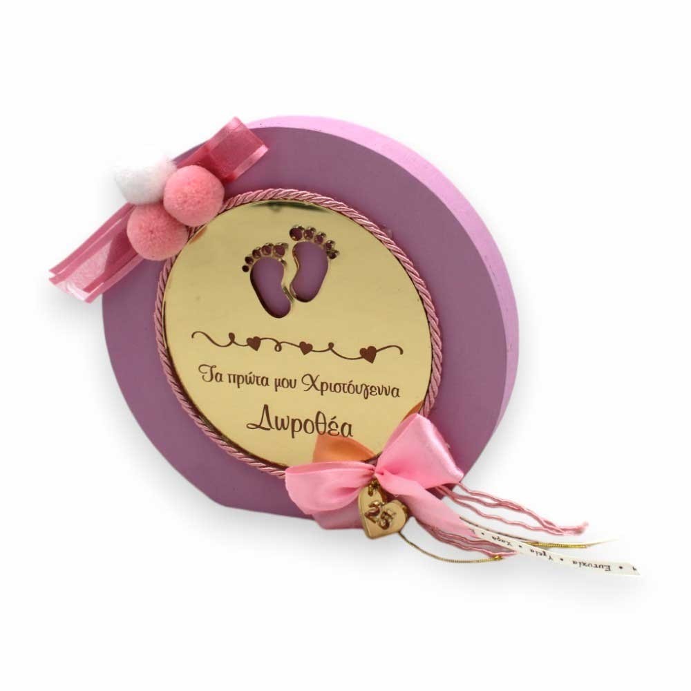 Στην κεντρική επιφάνεια, ένα χαριτωμένο σχέδιο με πατουσάκια και χαραγμένο μήνυμα για τα πρώτα Χριστούγεννα δημιουργούν ένα ζεστό και αξέχαστο ενθύμιο. Ιδανικό για να θυμάστε για πάντα αυτή τη σημαντική στιγμή!