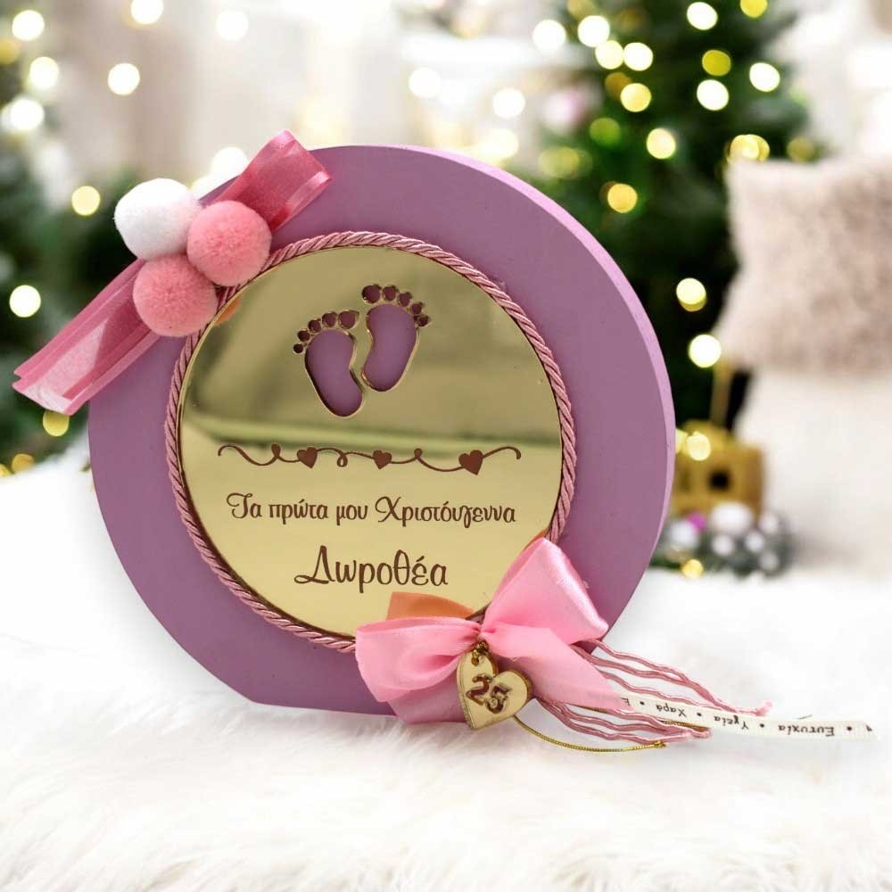 Ένα μοναδικό χριστουγεννιάτικο αναμνηστικό για τα πρώτα Χριστούγεννα του μωρού σας, κατασκευασμένο από ξύλο και χρυσό καθρέφτη πλεξιγκλάς.