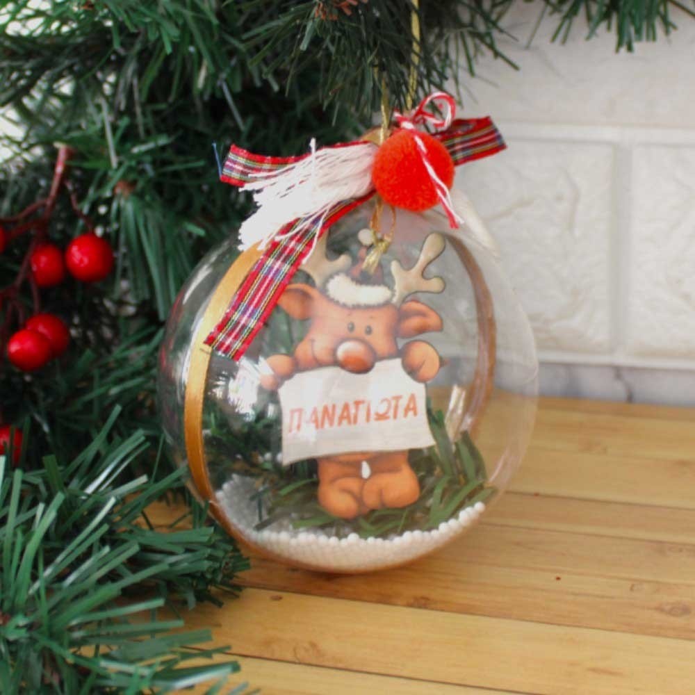 Η ακρυλική μπάλα διαμέτρου 10 εκ. περιλαμβάνει ένα γλυκό ταρανδάκι που κρατάει το όνομα της επιλογής σας, με πράσινα κλαδάκια και μπαλίτσες χιονιού για να δημιουργεί αίσθηση χριστουγεννιάτικης μαγείας.