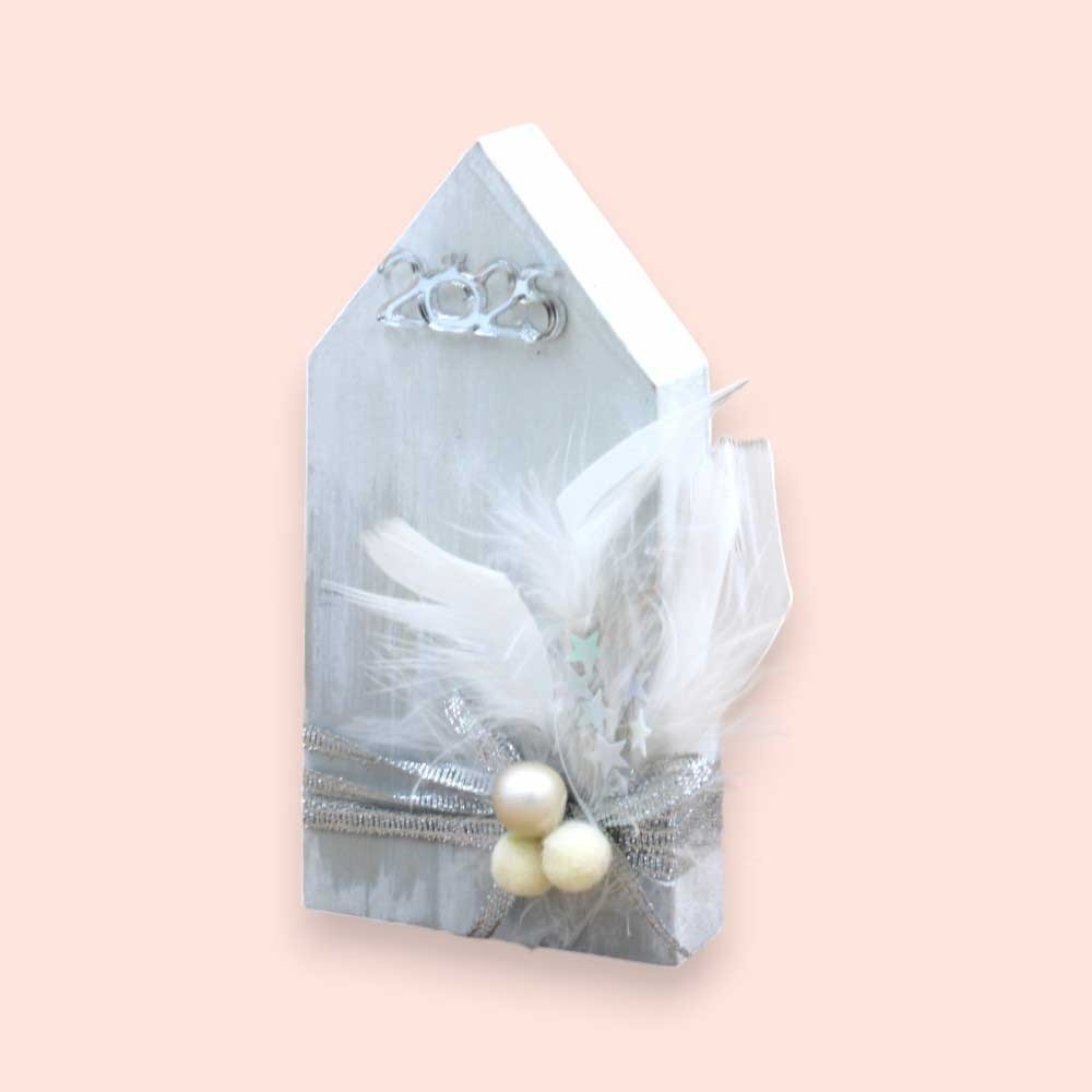 Κομψό ξύλινο επιτραπέζιο γούρι για το 2025, διακοσμημένο με  λευκά πούπουλα, ασημί κορδέλες, αστεράκια λευκές μπαλίτσες και χρονολογία από ασημί καθρέφτη πλεξιγκλάς.
