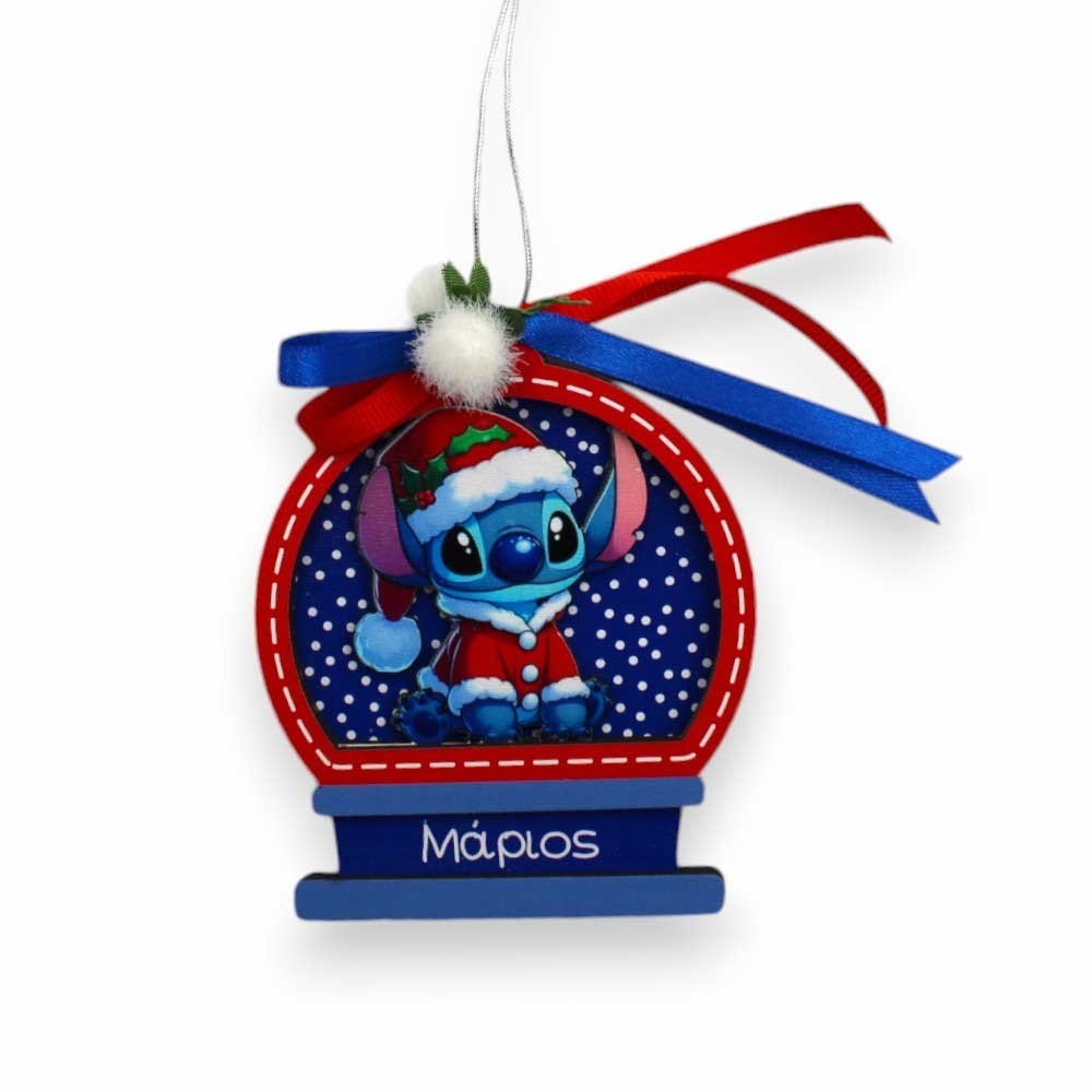 Στο κέντρο του στολιδιού υπάρχει ο γλυκούλης stitch, ενώ στο κάτω μέρος τυπώνεται το όνομα της επιλογής σας, καθιστώντας το μοναδικό και προσωπικό. Διακοσμημένο με δύο κορδελάκια και δύο χνουδωτές μπαλίτσες, προσφέρει μια ζεστή και γιορτινή ατμόσφαιρα.