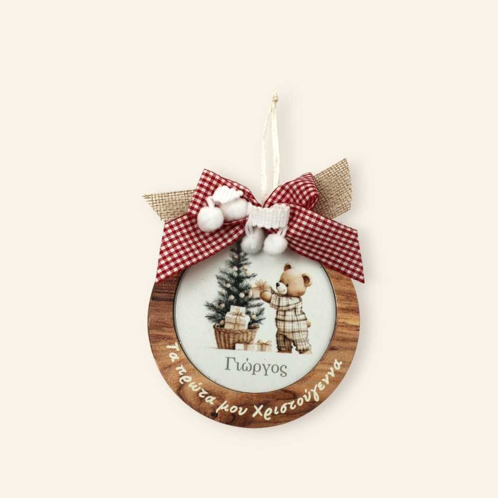 Ξύλινο χριστουγεννιάτικο στολίδι με αρκουδάκι και όνομα – προσωποποιημένο δώρο (10 εκ.)