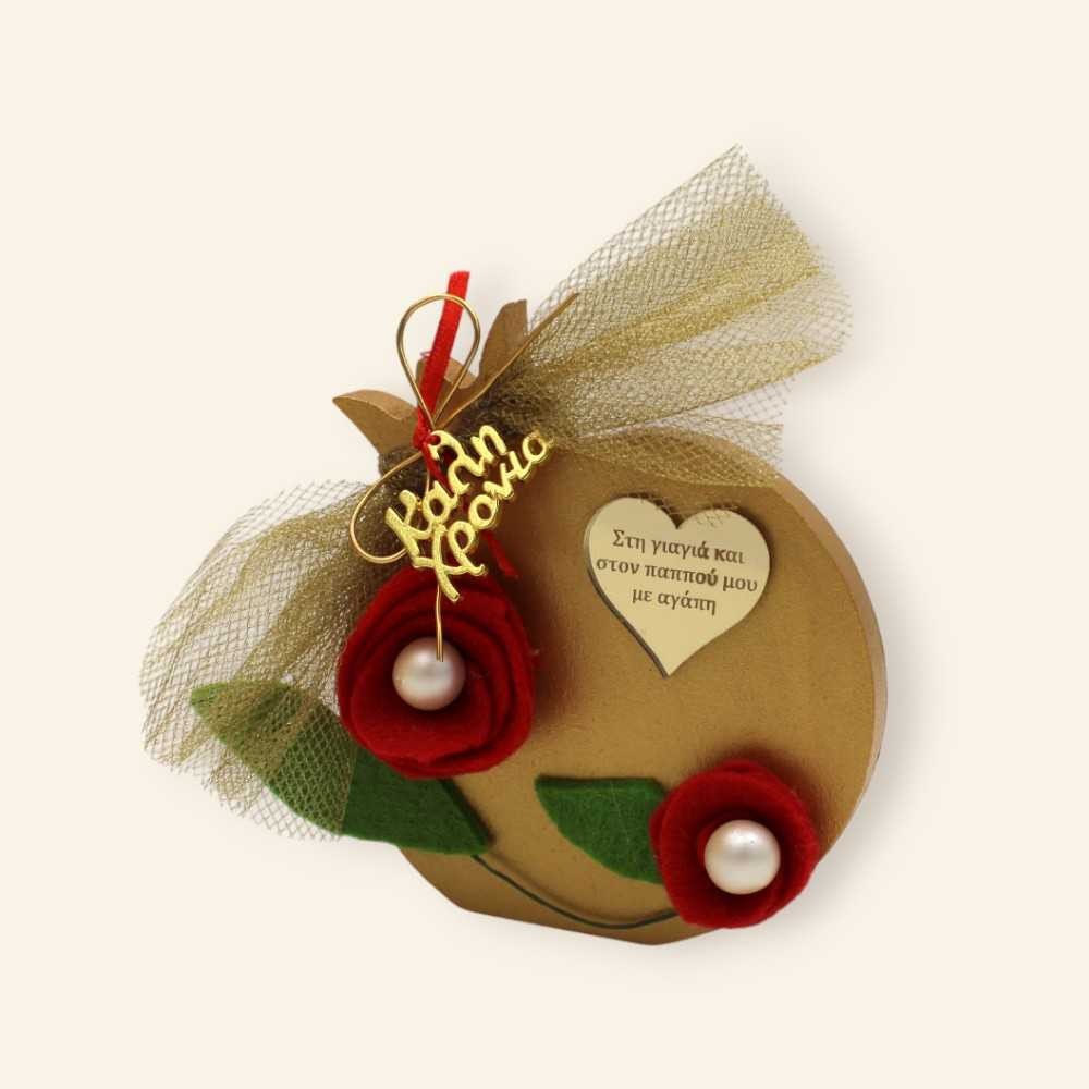 Βαμμένο στο χέρι με ζεστές αποχρώσεις, διακοσμείται με χειροποίητα λουλούδια από τσόχα, φιόγκο από χρυσό τούλι και μεταλλική φράση "Καλή Χρονιά" που προσθέτει λάμψη και γιορτινή διάθεση.