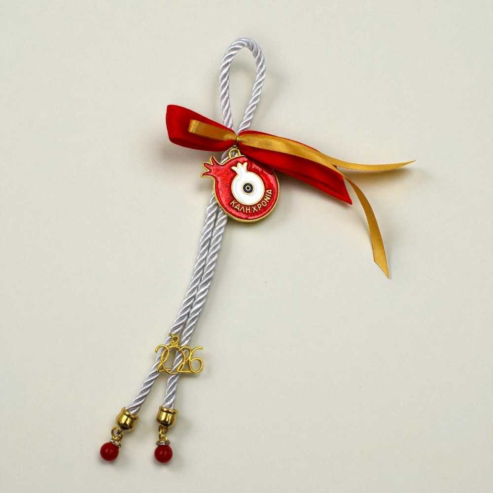 Το ρόδι, διαμέτρου 5 εκ., συνδυάζεται με λευκό στριφτό κορδόνι, χρυσές και κόκκινες κορδέλες, μεταλλικά στοιχεία και χρυσό «2026».