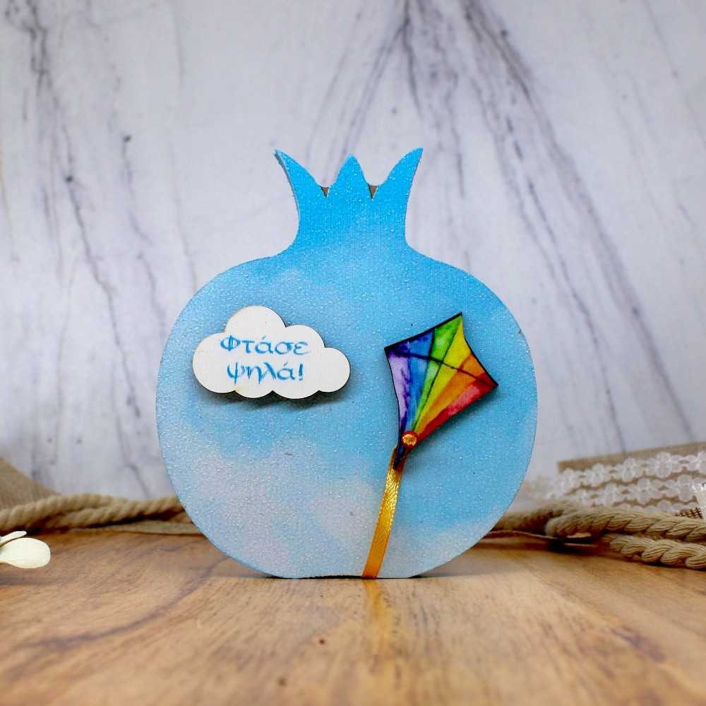 Χειροποίητο ξύλινο ρόδι – σύμβολο τύχης και ευημερίας – με την ευχή «Φτάσε ψηλά» τυπωμένη σε φόντο απαλό γαλάζιο που θυμίζει ουρανό.