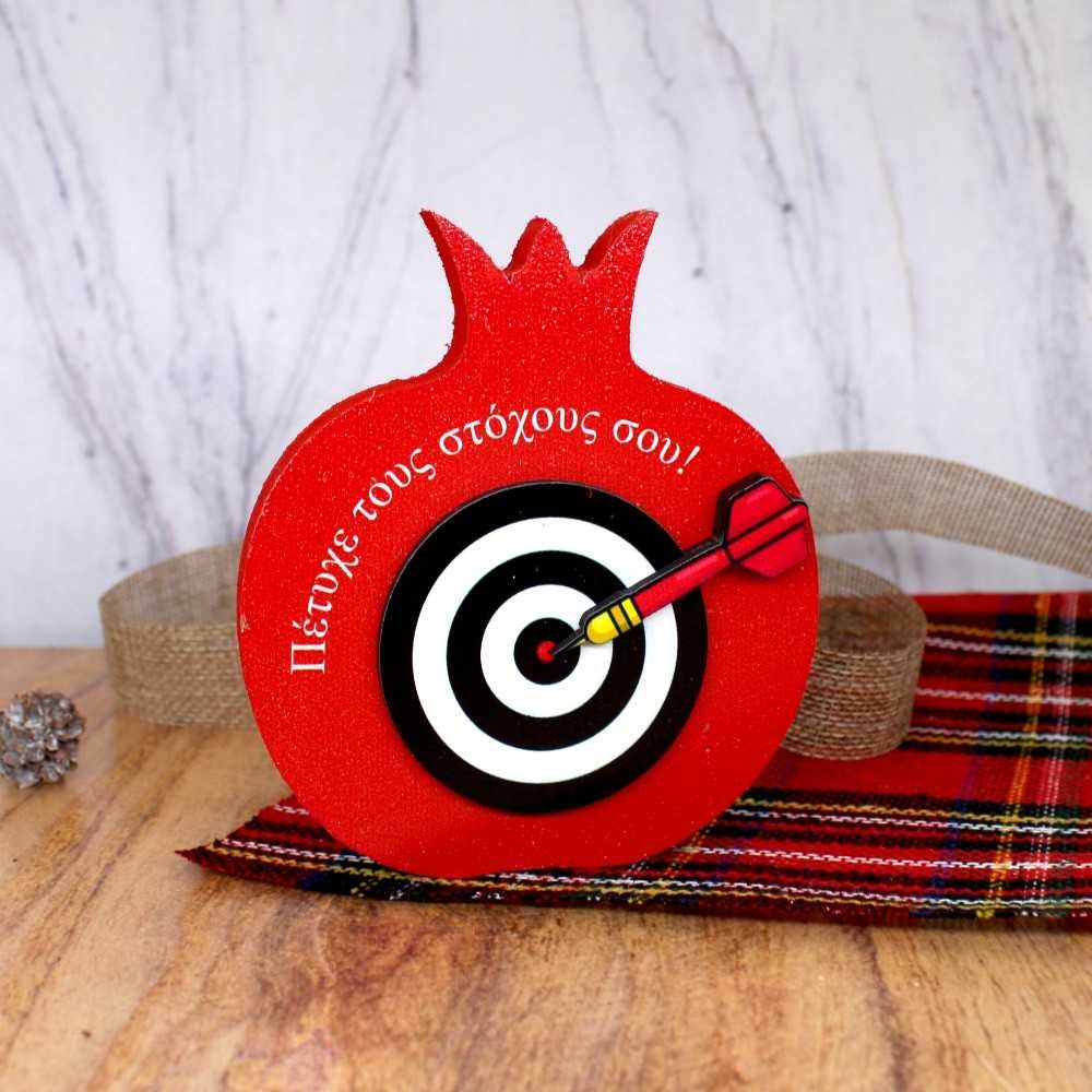 Χειροποίητο ξύλινο ρόδι – σύμβολο καλής τύχης και ευημερίας – με την ευχή «Πέτυχε τους στόχους σου!».