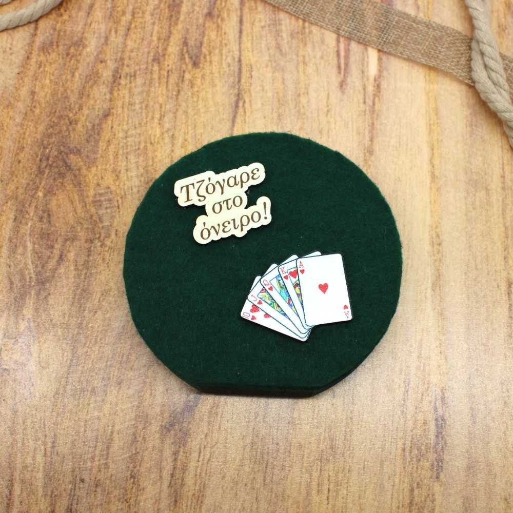 Η ξύλινη φράση «Τζόγαρε στο όνειρο!» συνοδεύεται από μικρά ξύλινα τραπουλόχαρτα, δημιουργώντας ένα δώρο γεμάτο χιούμορ, έμπνευση και τόλμη.