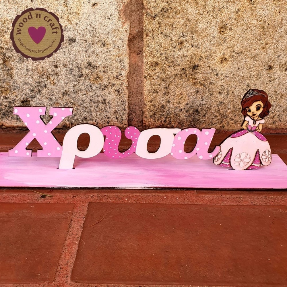 Ξύλινο χειροποίητο σταντ όνομα διακοσμημένο με την πριγκίπισσα Σοφία. Ένα μοναδικό διακοσμητικό ιδανικό και για να στολίσει το πιο όμορφο παιδικό δωμάτιο!