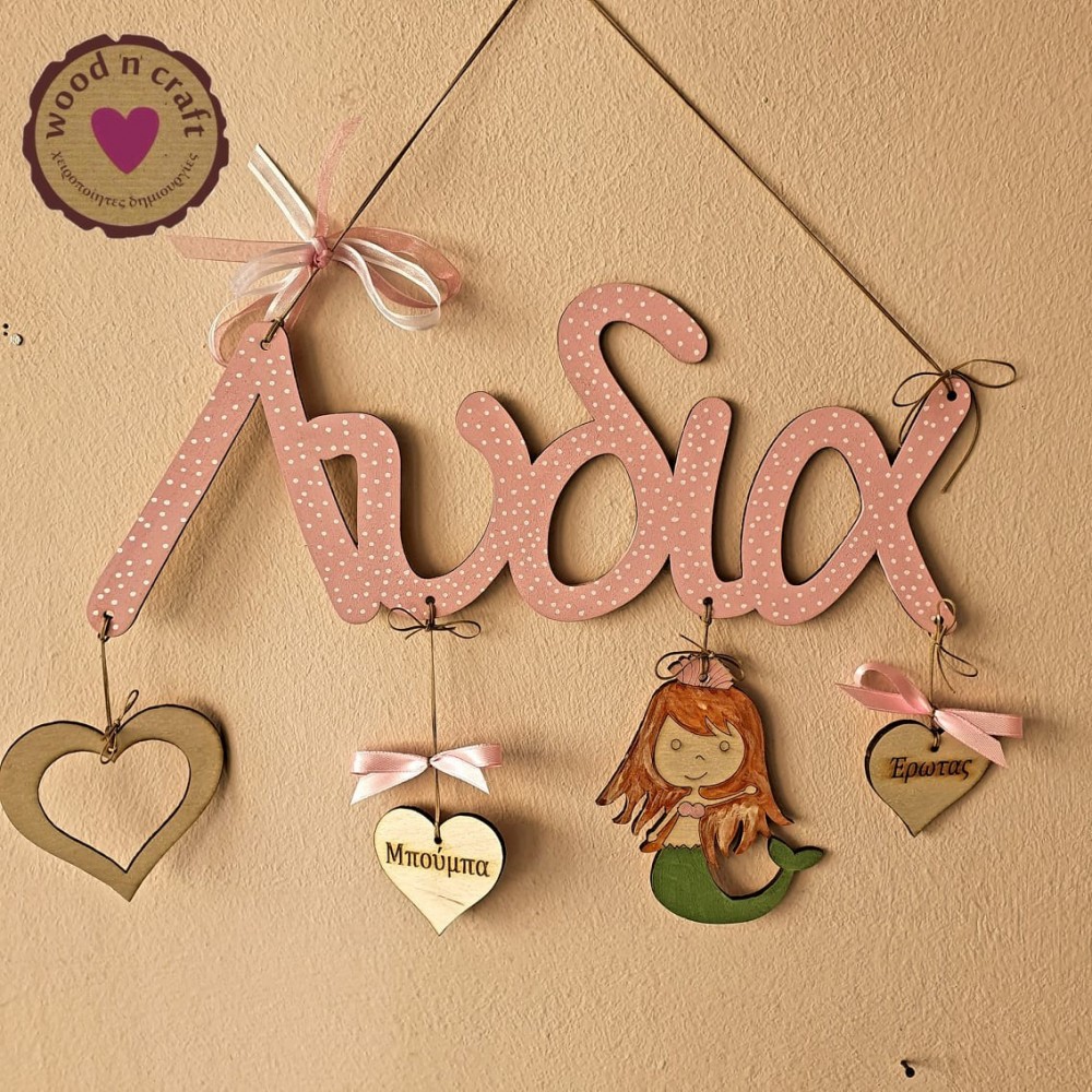 Ξύλινο χειροποίητο αναμνηστικό όνομα της επιλογής σας διακοσμημένο με μία γοργόνα, κρεμαστές ευχές και κορδελάκια!