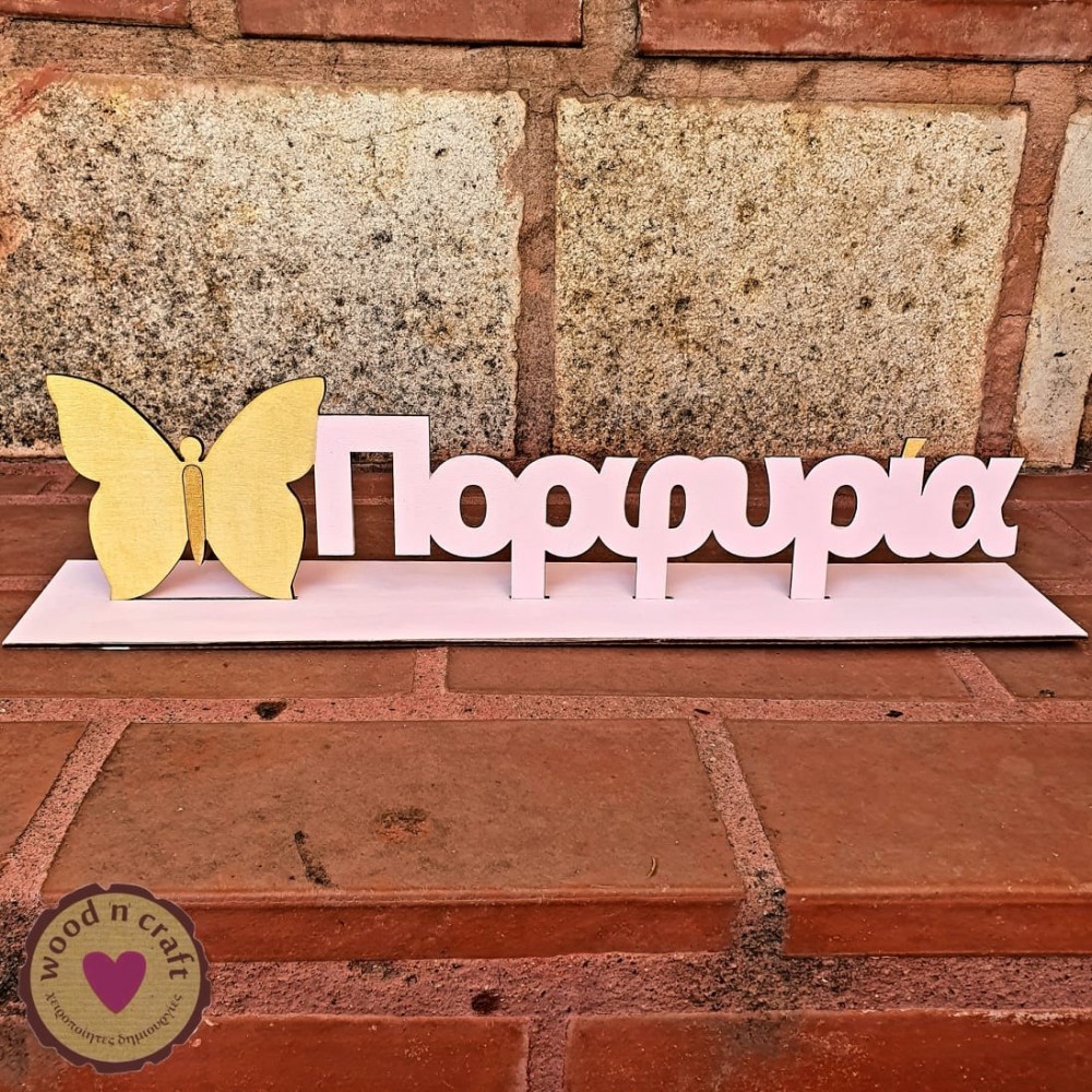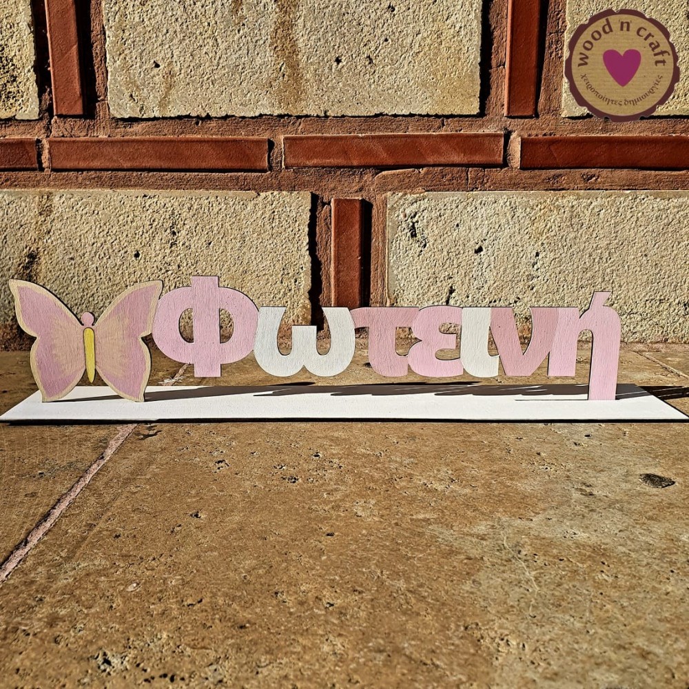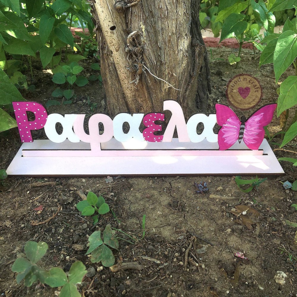 Ξύλινο χειροποίητο σταντ όνομα διακοσμημένο με πεταλούδα ζωγραφισμένη στο χέρι. Ένα ενθύμιο γέννησης ιδανικό και για την διακόσμηση του παιδικού δωματίου! Βάφεται σε χρώμα της επιλογής σας.