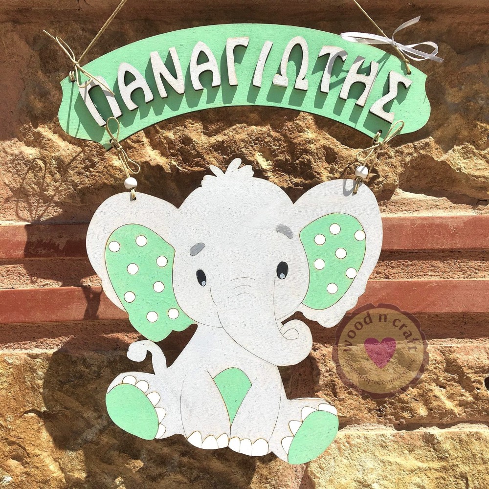 Ξύλινο χειροποίητο παιδικό διακοσμητικό σε σχέδιο ελεφαντάκι και κρεμαστή ταμπέλα με όνομα. Βαμμένο στα χρώματα της επιλογής σας.